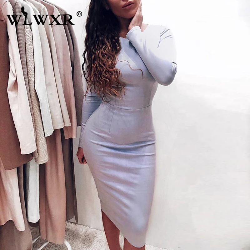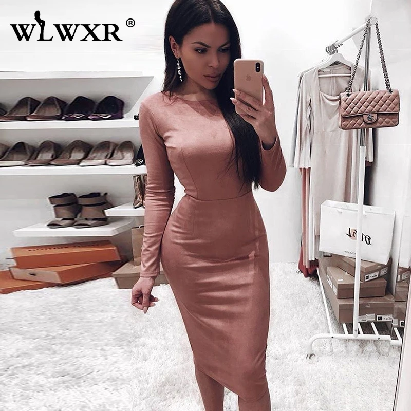 WLWXR осень-зима элегантный пикантный облегающий платье с длинными рукавами и круглым вырезом, замшевое женское платье-миди, приталенное вечернее платье для ночного клуба