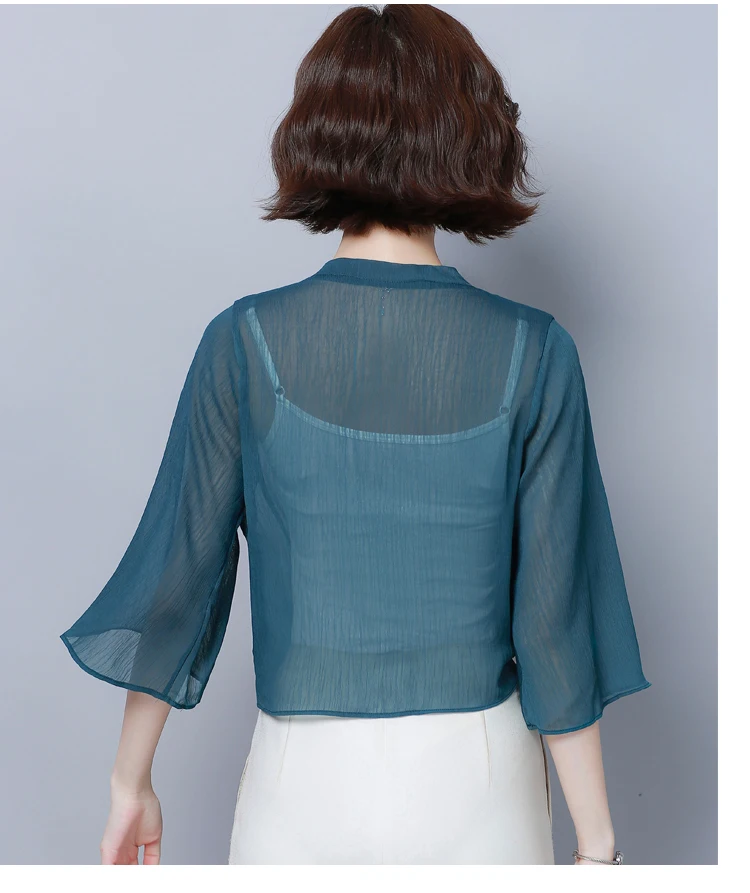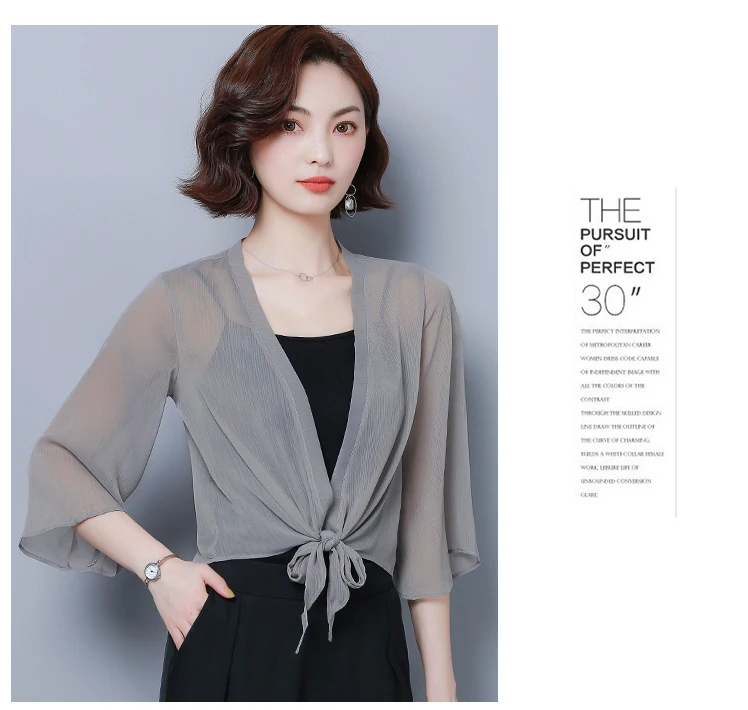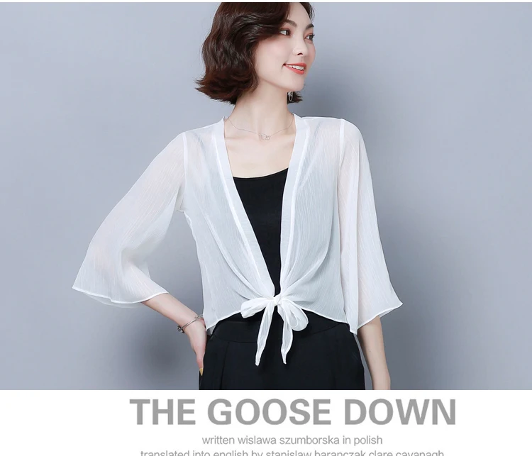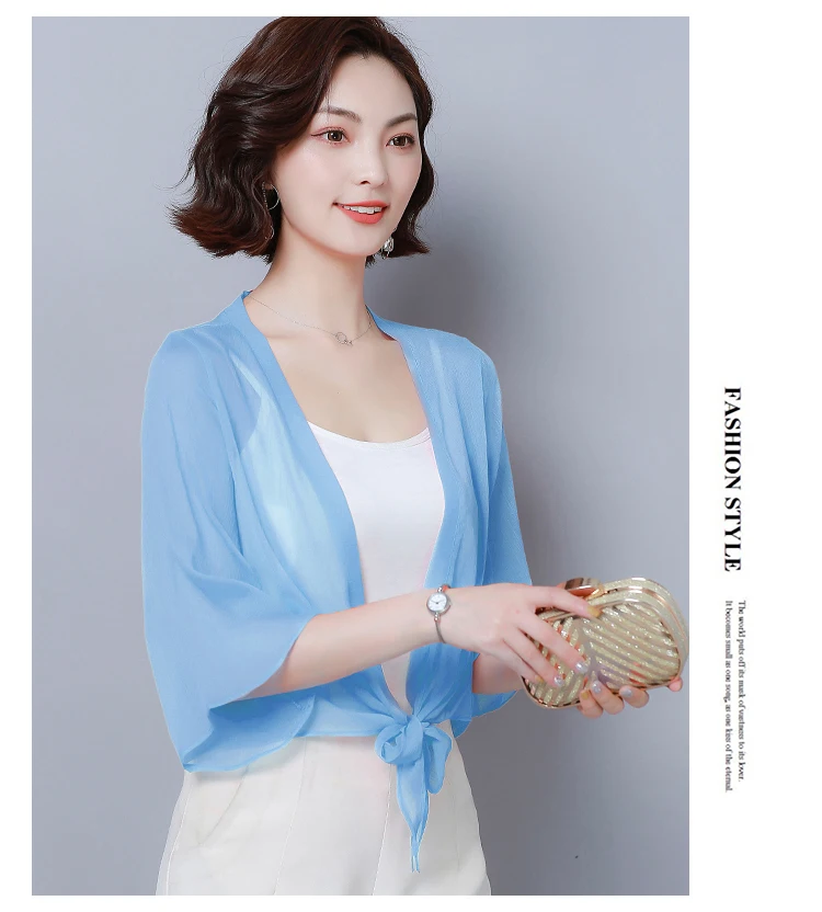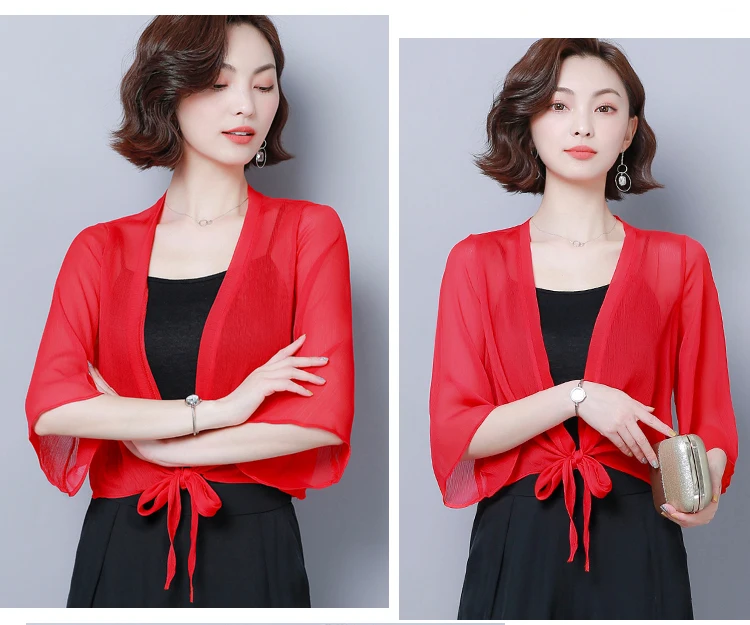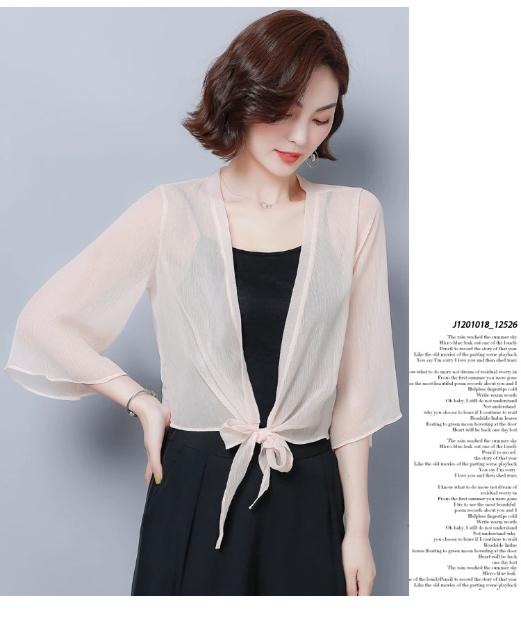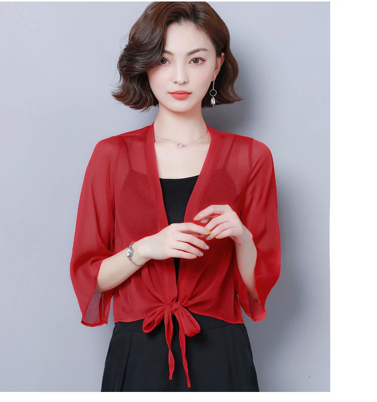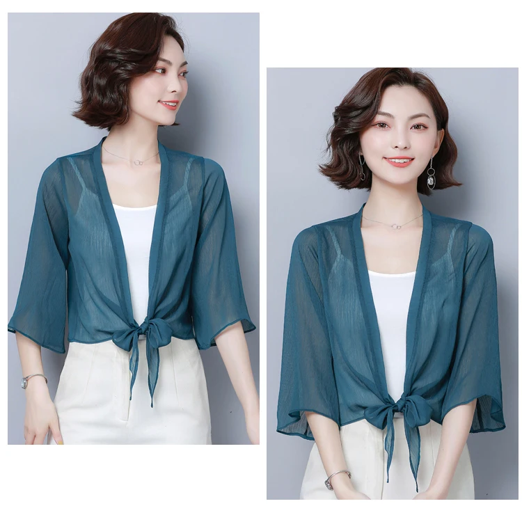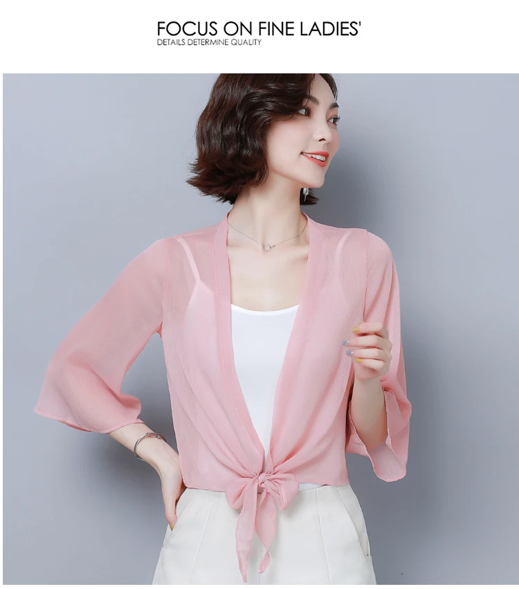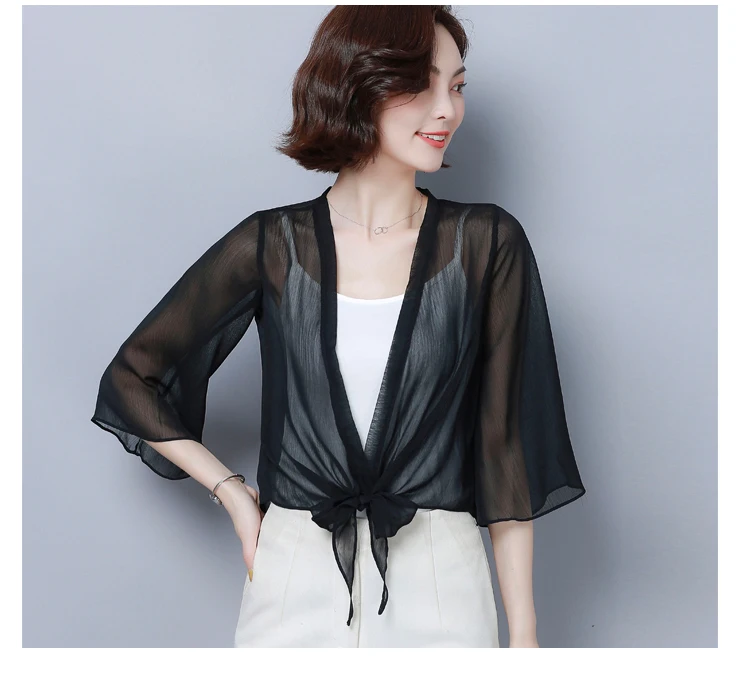 Summer Chiffon Blouses Kimono Cardigan Mesh Transparent Sunscreen Women Beach Cover Up Outwear Plus Size Bow Wrap Shirt Cardigan