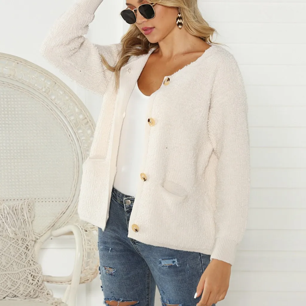 Women Casual Pullover Pocket Button long Sleeve Knitted Sweater Loose Cardigan