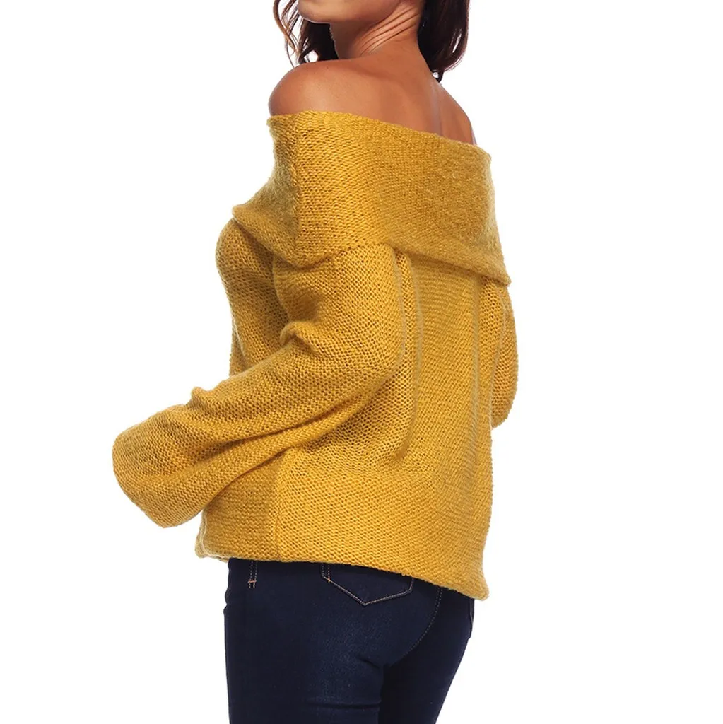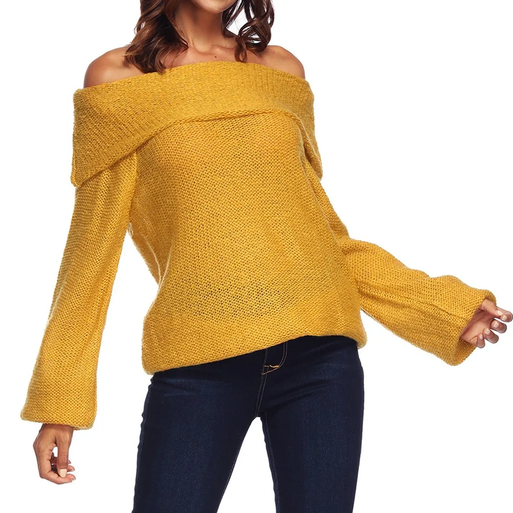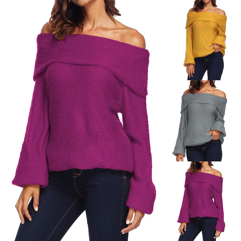 Модный женский свитер сплошной цвет с открытыми плечами трикотажная Свободная блуза с длинным рукавом