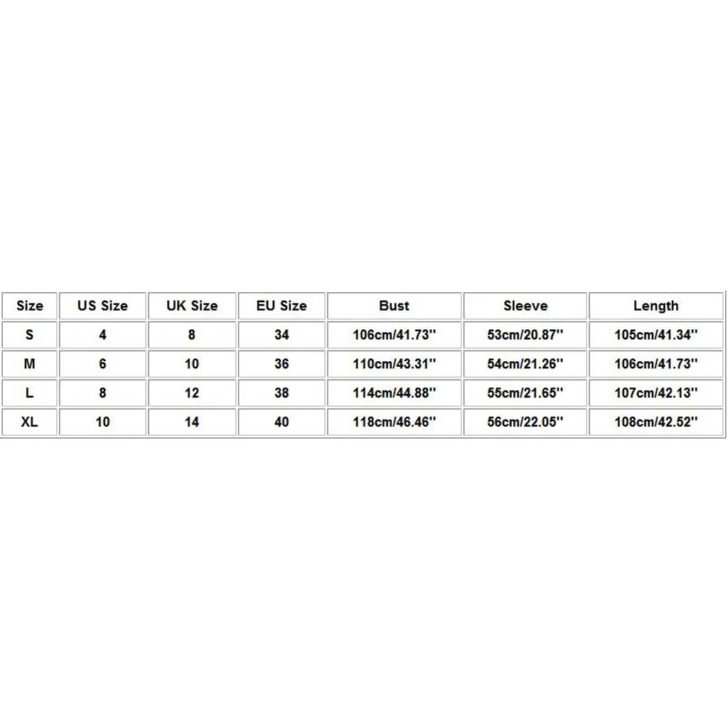 Size US Size UK Size EU Size Bust Sleeve Length S 4 8 34 106cm/41.73'' 53cm/20.87'' 105cm/41.34'' M 6 10 36 110cm/43.31'' 54cm/21.26'' 106cm/41.73'' L 8 12 38 114cm/44.88'' 55cm/21.65'' 107cm/42.13'' XL 10 14 40 118cm/46.46'' 56cm/22.05'' 108cm/42.52''