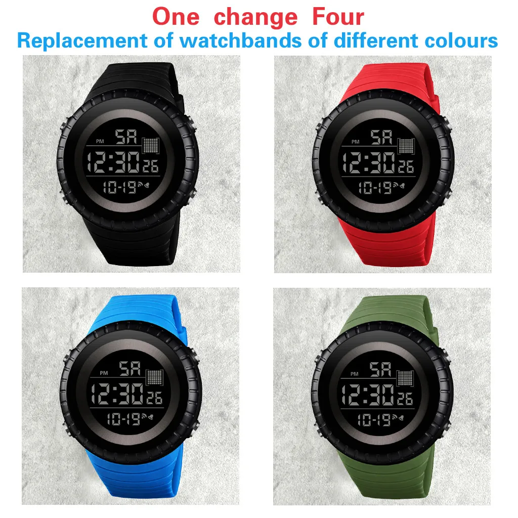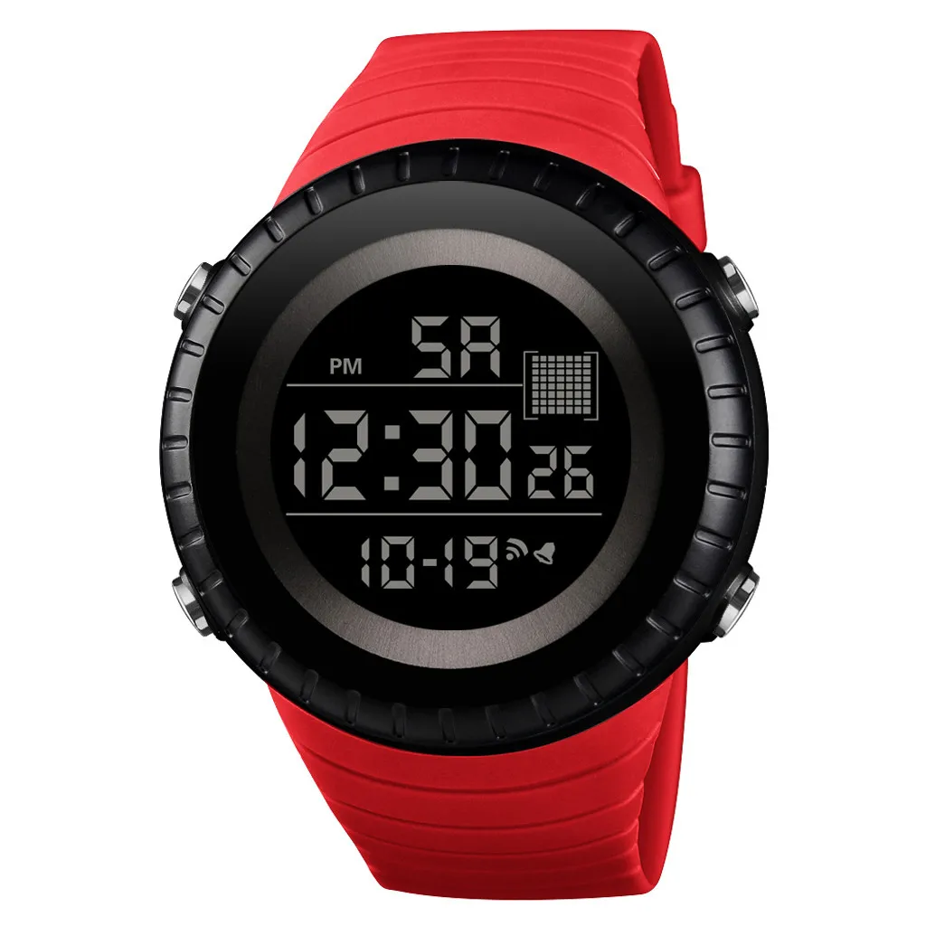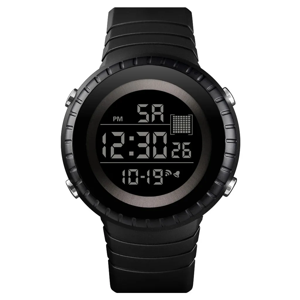 Многофункциональность: отображение времени, секундомер, подсветка, отображение даты, отображение недели, таймер отключения часов, 12/24 почасовой, водонепроницаемый, ударопрочный,