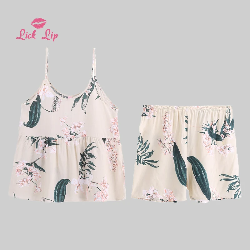 Заставляет губы тонкие небольшие свежие женские пижамный комплект с принтом Ночная сорочка на бретельках Повседневное дышащая домашняя пижама SWD10578-3 2019.8.28