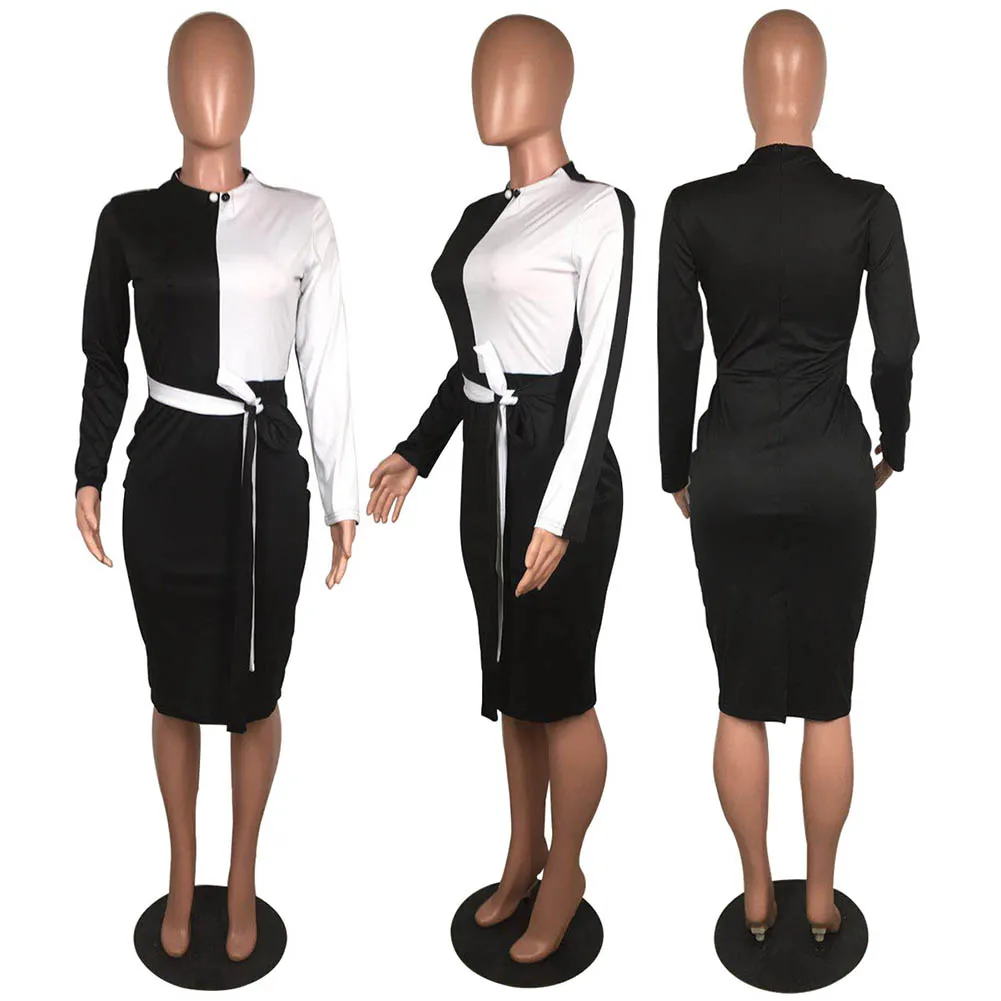 Офисное женское сексуальное комбинированное цветное платье с длинным рукавом и круглым вырезом на молнии, повседневное облегающее женское платье-карандаш миди, вечерние платья