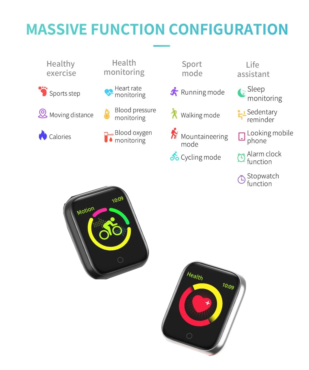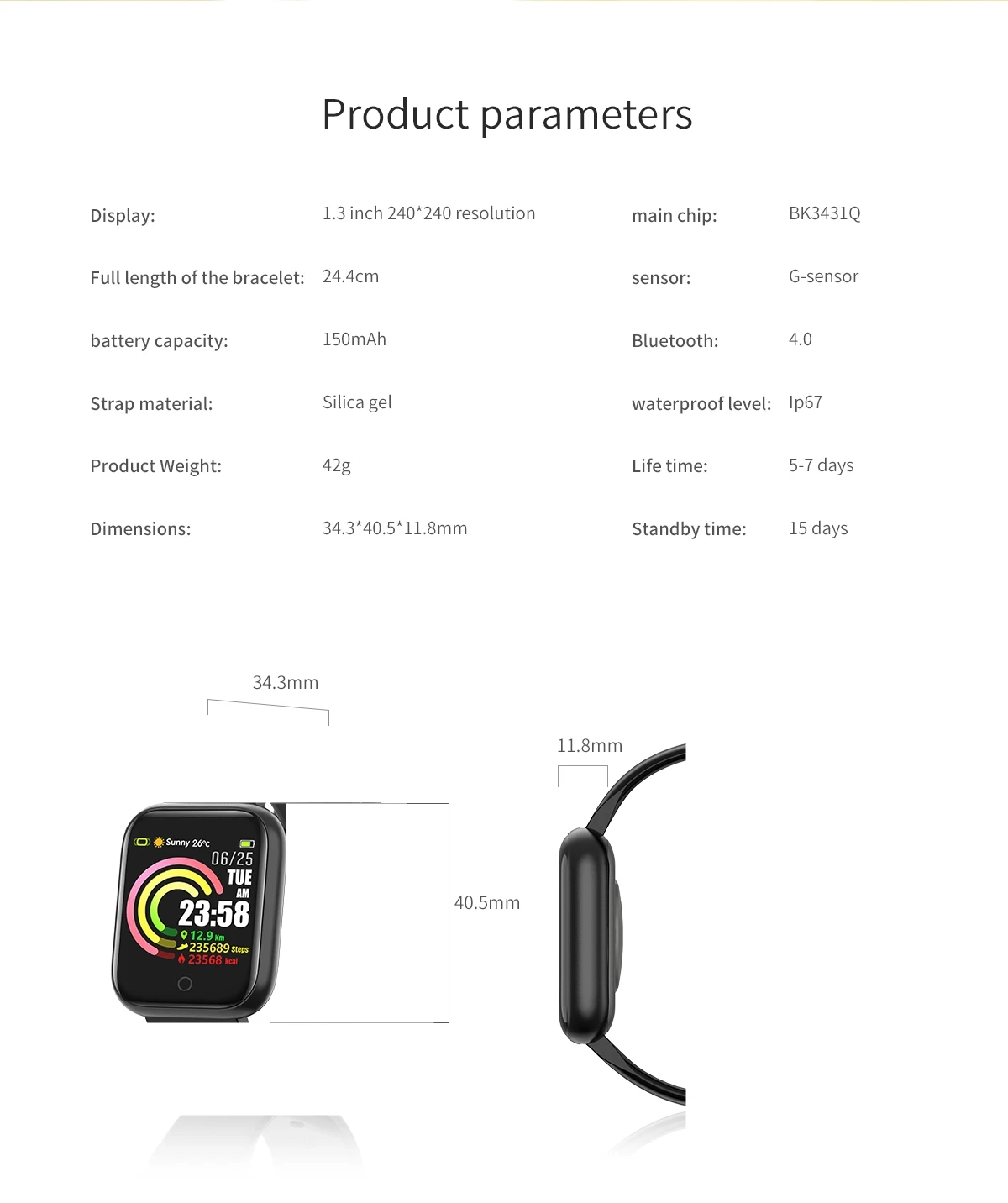 * 1,3 дюймов 240*240 IPS цветной сенсорный Экран * Встроенный аккумулятор емкостью 150 мАч, время работы в режиме ожидания 15 дней, обычно рабочее время 4-6 дней. * IP67 водонепроницаемый и пыленепроницаемый (можно носить под дождем, мыть руки, но не помещать в горячую воду) * Мультиспортивный режим * Динамический Монитор артериального давления и кислорода в крови, мониторинг сердечного ритма в реальном времени для защиты вашего здоровья. * Напоминание о звонках, SMS, QQ, WeChat напоминание (отображение содержимого и имени), Facebook, Whatsapp, Twitter, Skype и т. Д. Напоминания о социальных приложениях * Поддержка версии iOS 9,0 выше и версии Android 4,4 выше * Дополнительные функции: отображение времени, отображение иконок батареи, отображение даты, отображение дня недели, отображение времени сна, поиск браслета, фото телефона с пультом дистанционного управления, режим «Не беспокоить», поднятие экрана руки, настройки Формата времени, восстановление фабрики