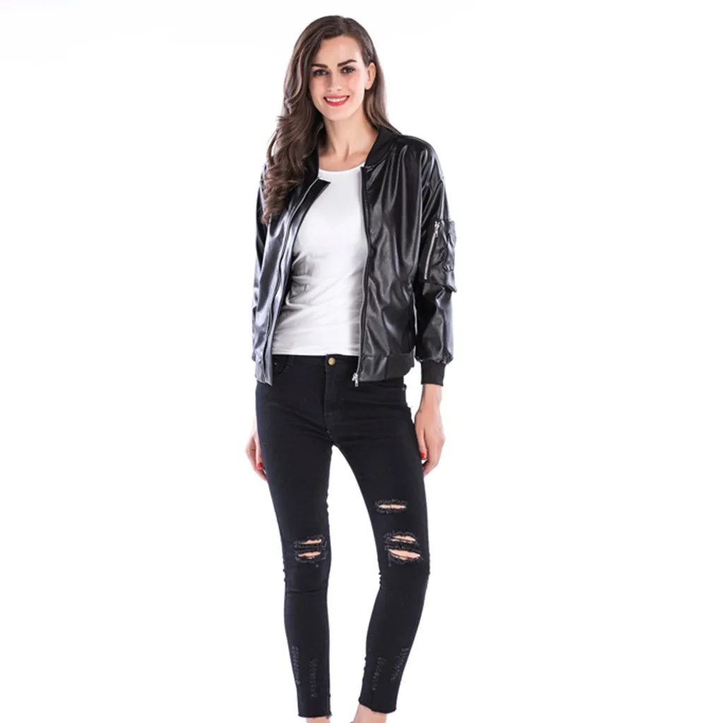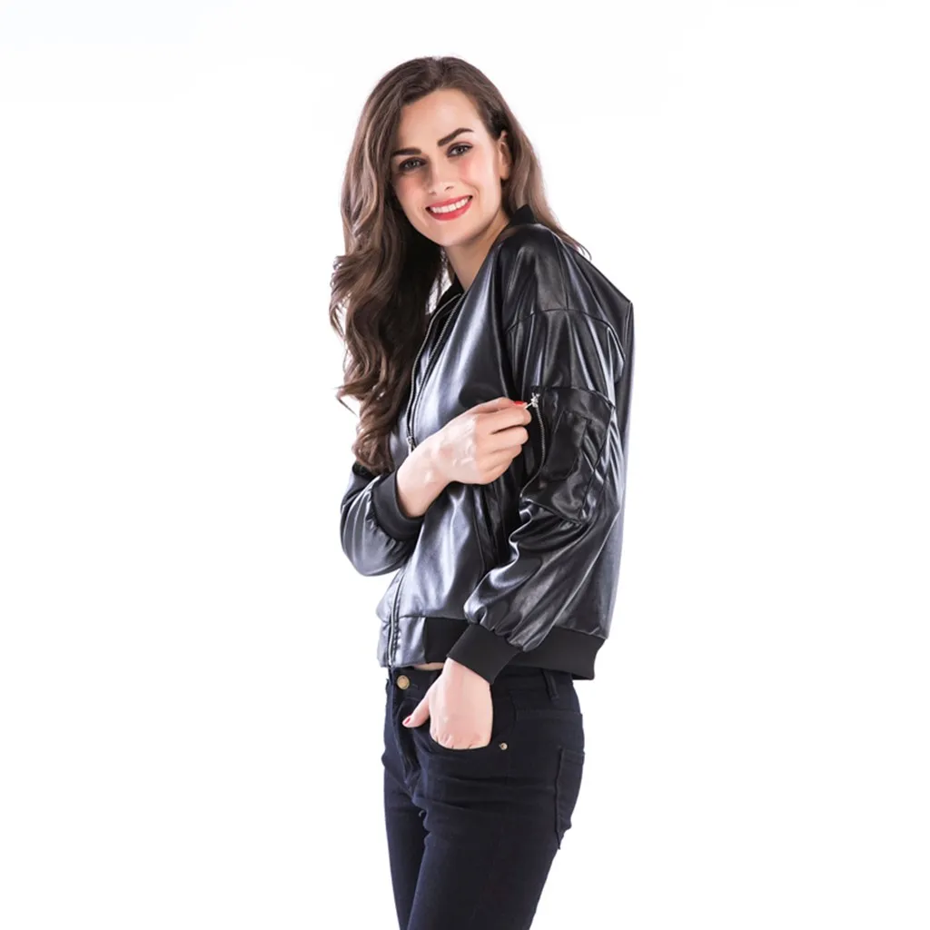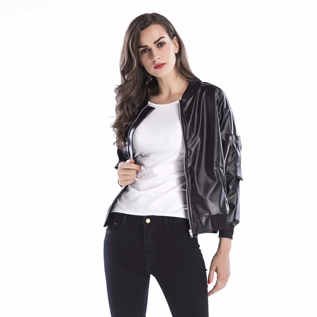 Для женщин Осенне-зимняя трендовая кожаная куртка на молнии с воротником-стойкой черное кожаное пальто