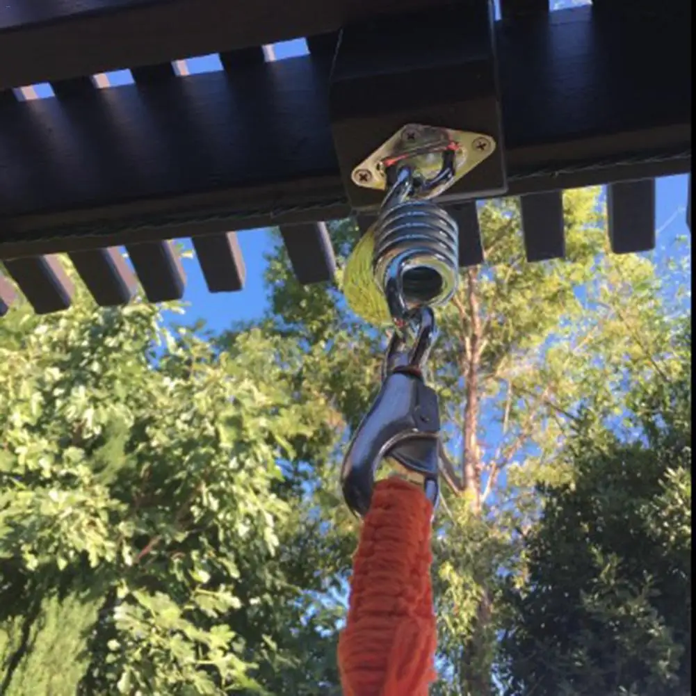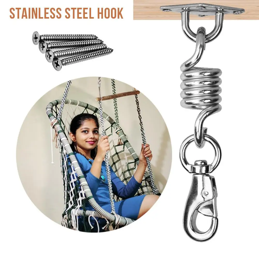 Rugged and easy to install and use.The spring capacity is approximately 500 pounds, which helps to reduce the impact pressure.The swivel hook can be rotated 360 degrees without any blemishes or twists, and the hook will securely clip the clip to the hammock or rocking chair.Suitable for mesh chairs, porch swings, rocking chairs, sandbags or great accessories for hanging on any other heavy objects installed overhead.Heavy duty hook mounting plate, spring, spring hook, swivel hook for mesh chairs and other mounting accessories such as drill bags, suspension equipment, etc. Parameters: