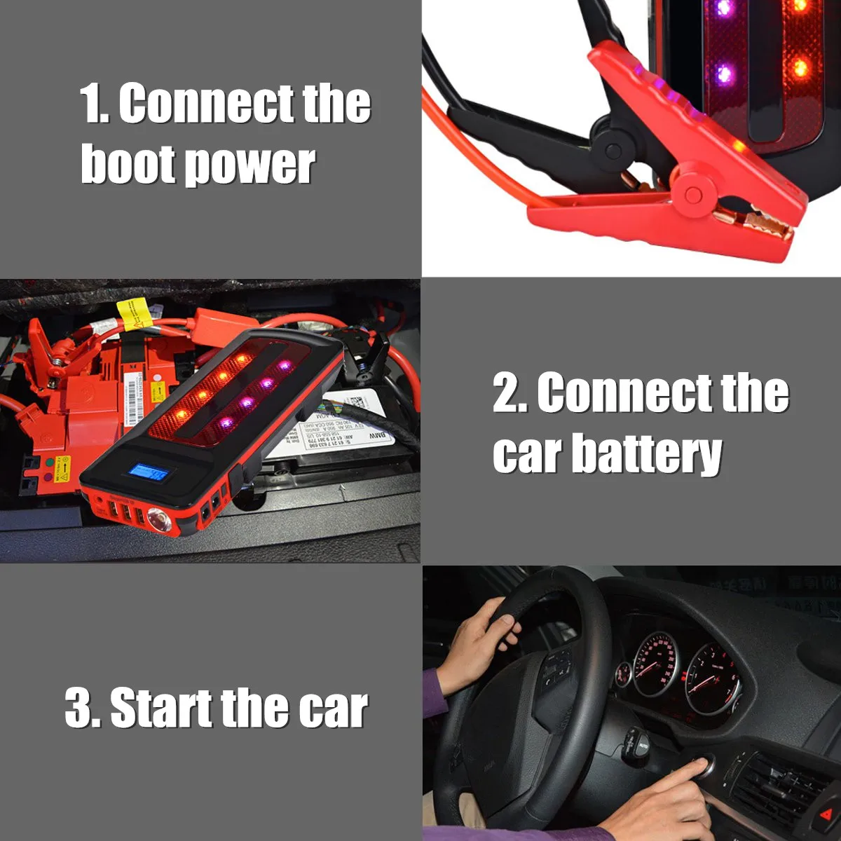 1. Перед запуском автомобиля, пожалуйста, убедитесь, что главный Минимальный светодиодный светильник 2 шт., затем подключите синий штекер полностью сидя в гнездо хоста, и подтвердите, что кабель с индикатором выключен. 2. Подключите красный зажим к положительной (+) клемме аккумулятора, черный зажим к отрицательной (-) клемме аккумулятора. 3. Запуск транспортного средства. 4. когда автомобили начинаются, пожалуйста, убедитесь, что Потяните зажим кабеля от банка питания, а затем от клеммы автомобильного аккумулятора. пожалуйста, не подключайте красный и черный зажим к клеммам аккумулятора транспортного средства в течение 30 С. Специальные инструкции по интеллектуальному соединительному кабелю: Работает по инструкции кабель с индикатором
