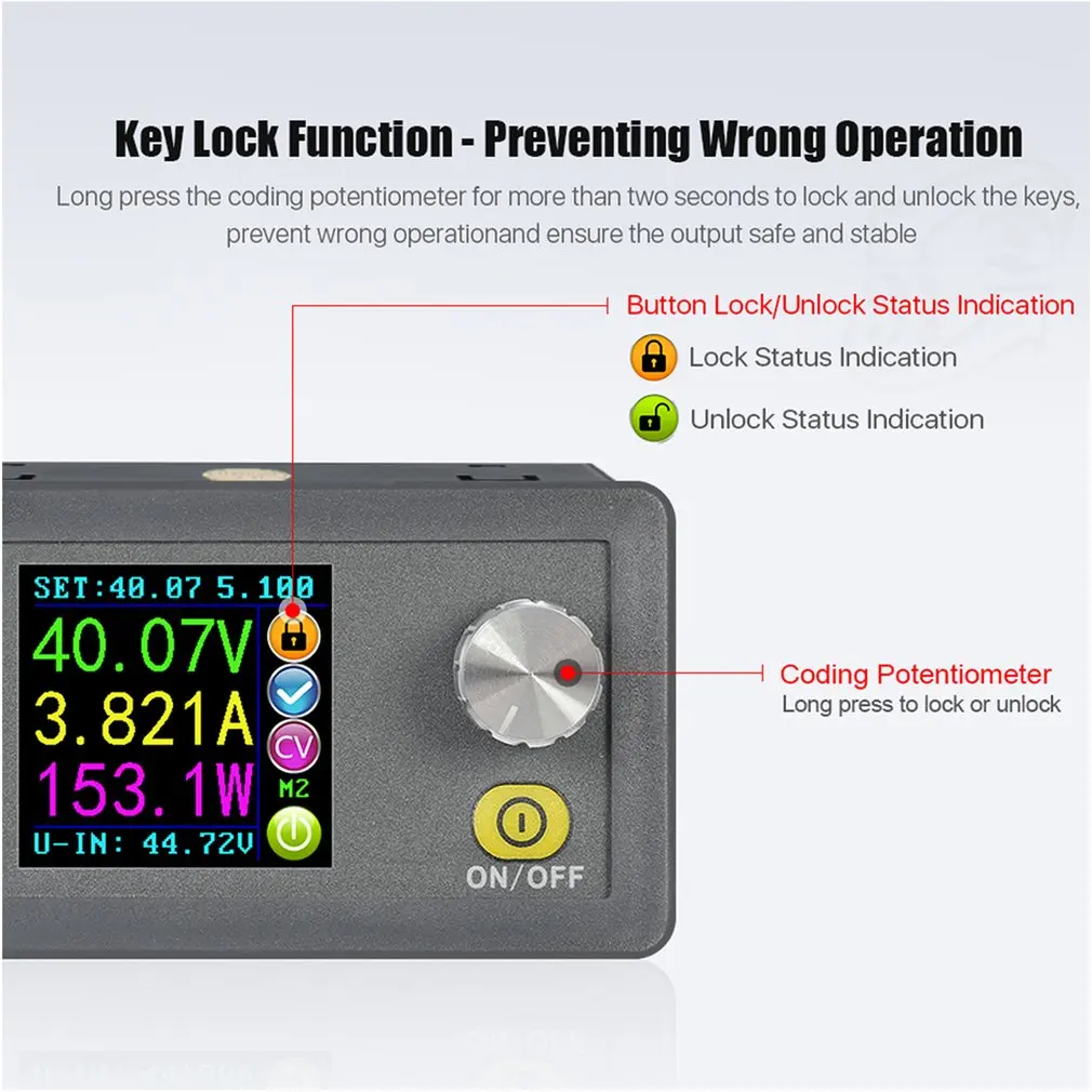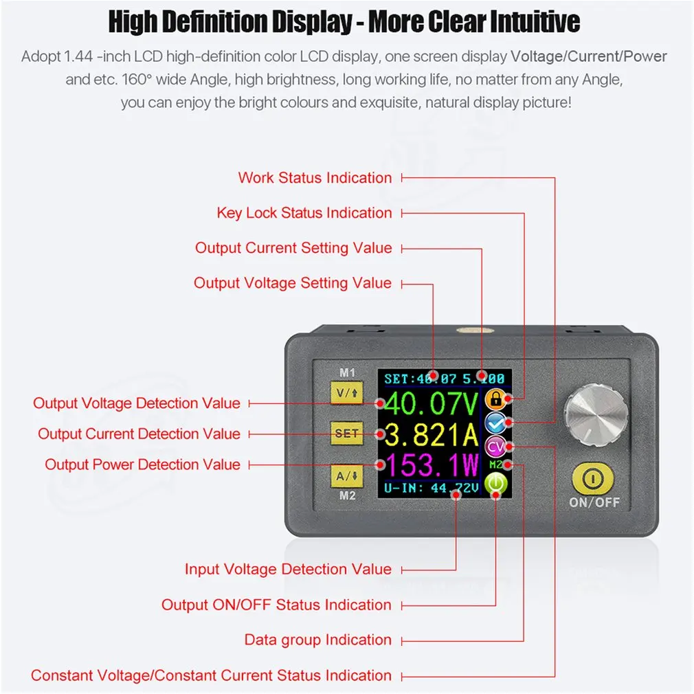 4. многофункциональность: вы можете просмотреть предустановленное напряжение, входное напряжение, выходное напряжение, предустановленный ток, выходной ток, выходную мощность и т. д. в области напоминания выходного состояния, вы можете видеть, что выход открывается или нет, состояние постоянного напряжения и постоянного тока, выход нормальный или нет, Ключ заблокирован или нет, и используемые в настоящее время группы данных.