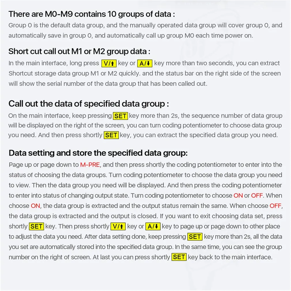 3. Strage данных: этот модуль имеет функцию отключения питания и может хранить 10 групп предустановленное значение. И он также имеет функцию извлечения быстро двух групп сохраненных значений.