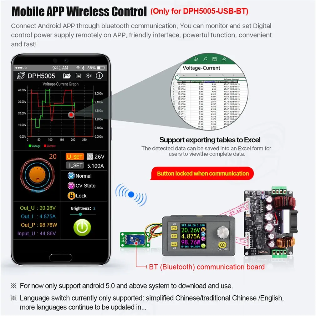 3. Поддержка функции связи USB bluetooth. DPH5005 версия связи приложение было выпущено, вы можете использовать bluetooth для подключения телефона andriod, это только suupport android 5,0 и выше.