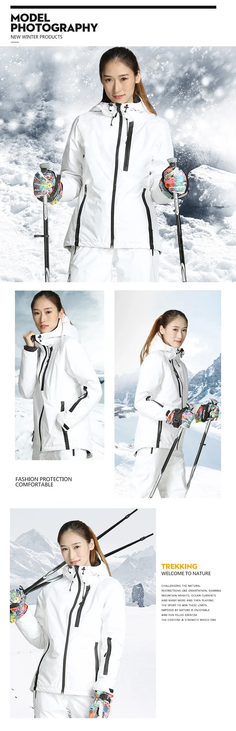 2. Коэффициент проницаемости 80003, эффект тепла-30 градусов4. Внутри сделан теплый светильник из хлопка DuPont.5. Дизайн с патентованным принтом, модный и великолепный.6. Встроенная снежная юбка, эффективно предотвращает попадание дождя и снега, уменьшает потерю температуры.