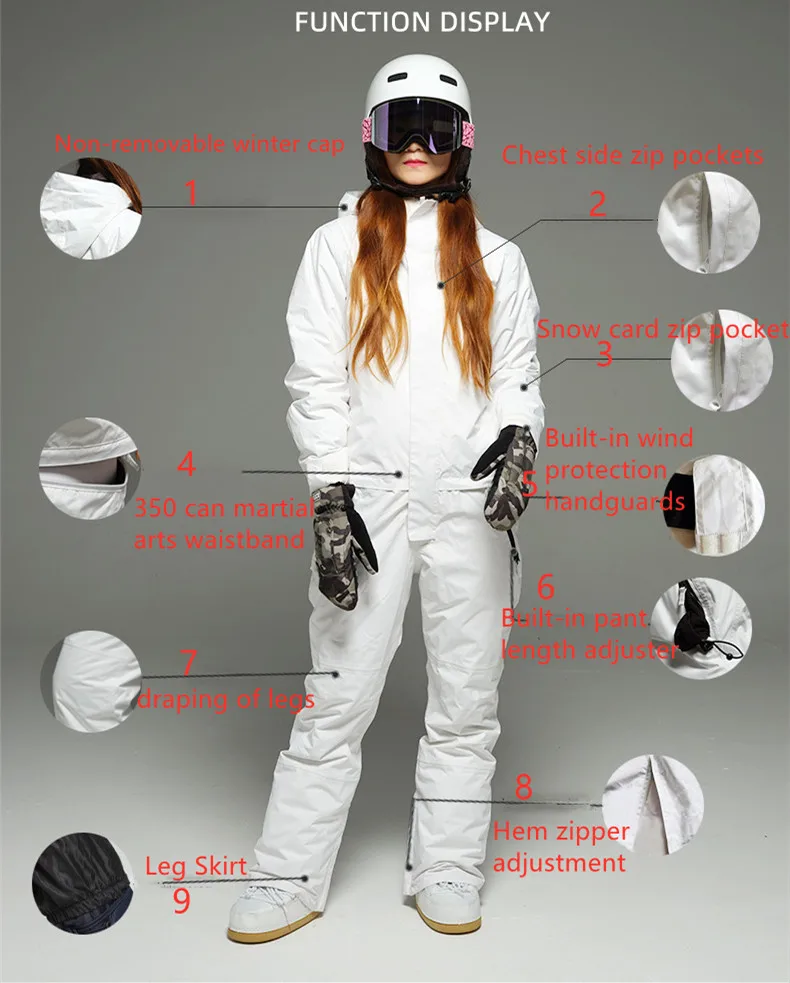 2. Permeability coefficient 80003, Warmth effect -30 degree4. Inside is filled with DuPont cotton, which is light and warm.5. Patent printing design, fashionable and gorgeous.6. Built in snow skirt, effectively prevent rain and snow intrusion, reduce temperature loss.7. The pants can be detachable in 350 circle.8. Color white is for female size, and color black is for male size.WHITE COLOR SIZE CHART