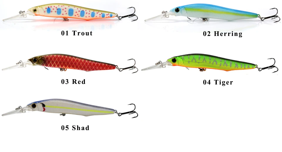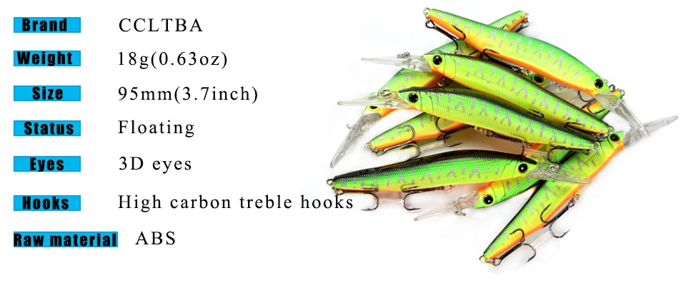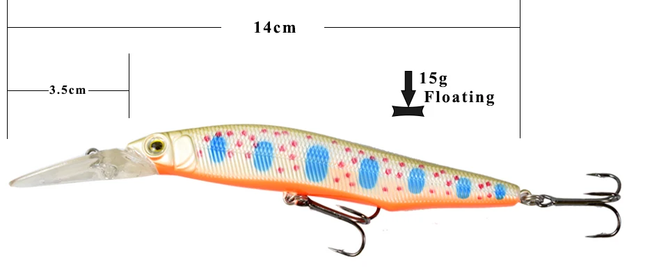 Каждая наша приманка была сделана с защитой окружающей среды высокого качества АБС жесткий пластик и другие прочные аксессуары, такие как сильные Крючки, провода, сплит кольца. Каждая наживка имеет тяжелое пальто с выдающимся цветом отделки. Как приманка, она копирует приманку рыбы и имеет подъем, как плавать действий. Имитирующий естественный цвет и волшебные цвета ручной краски подходят для любой рыбалки в пресной или соленой воде.