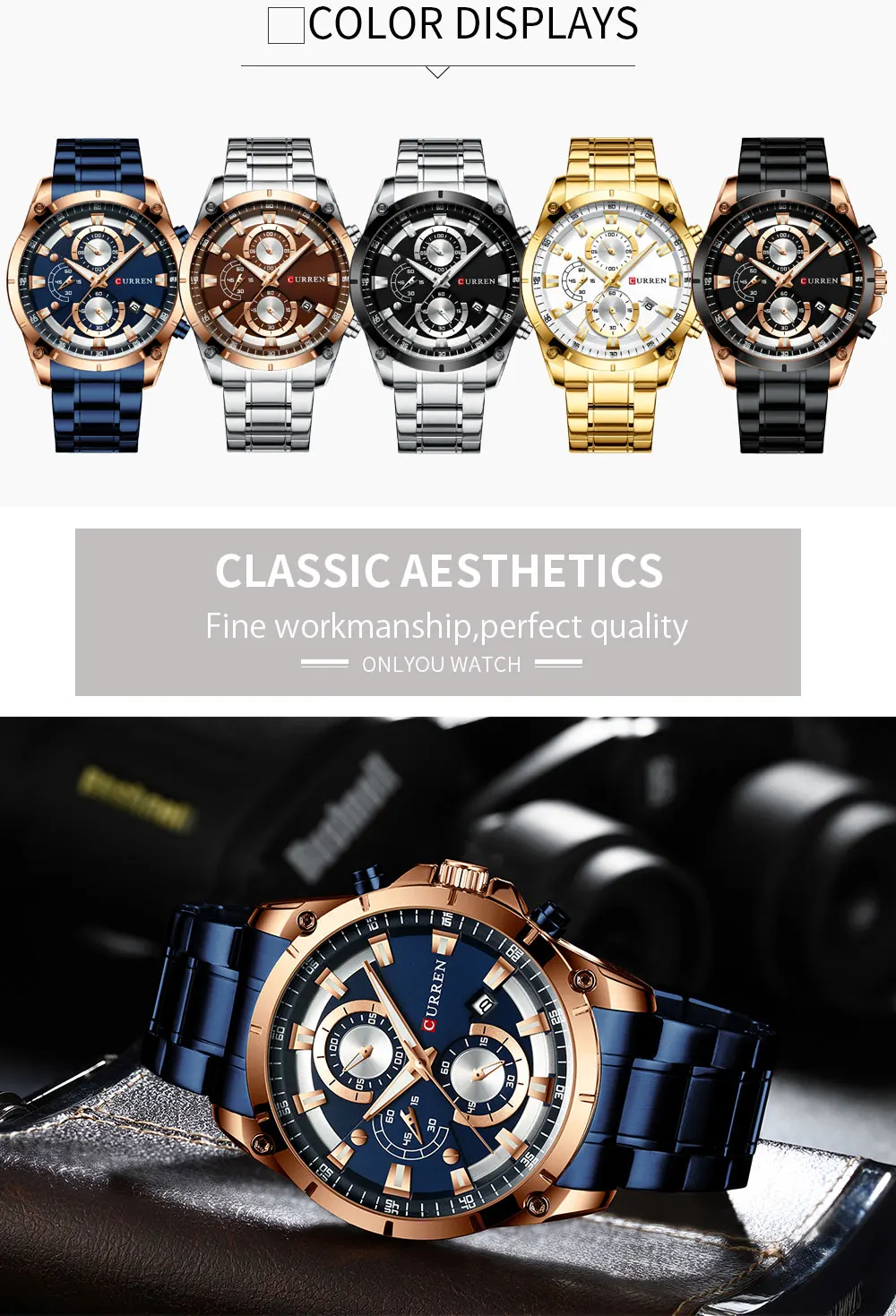 Торговая марка: CURREN Тип механизма: Кварцевый механизм Пол: Для Мужчин Дисплей: Аналоговый Материал:нержавеющая сталь Длина ремешка часов около: 25 см Приблизит. Ширина ремешка часов: 2,4 см Приблизит. Диаметр корпуса часов: 4,7 см Толщина корпуса: примерно 1,4 см Приблизительный вес часов: 155 г