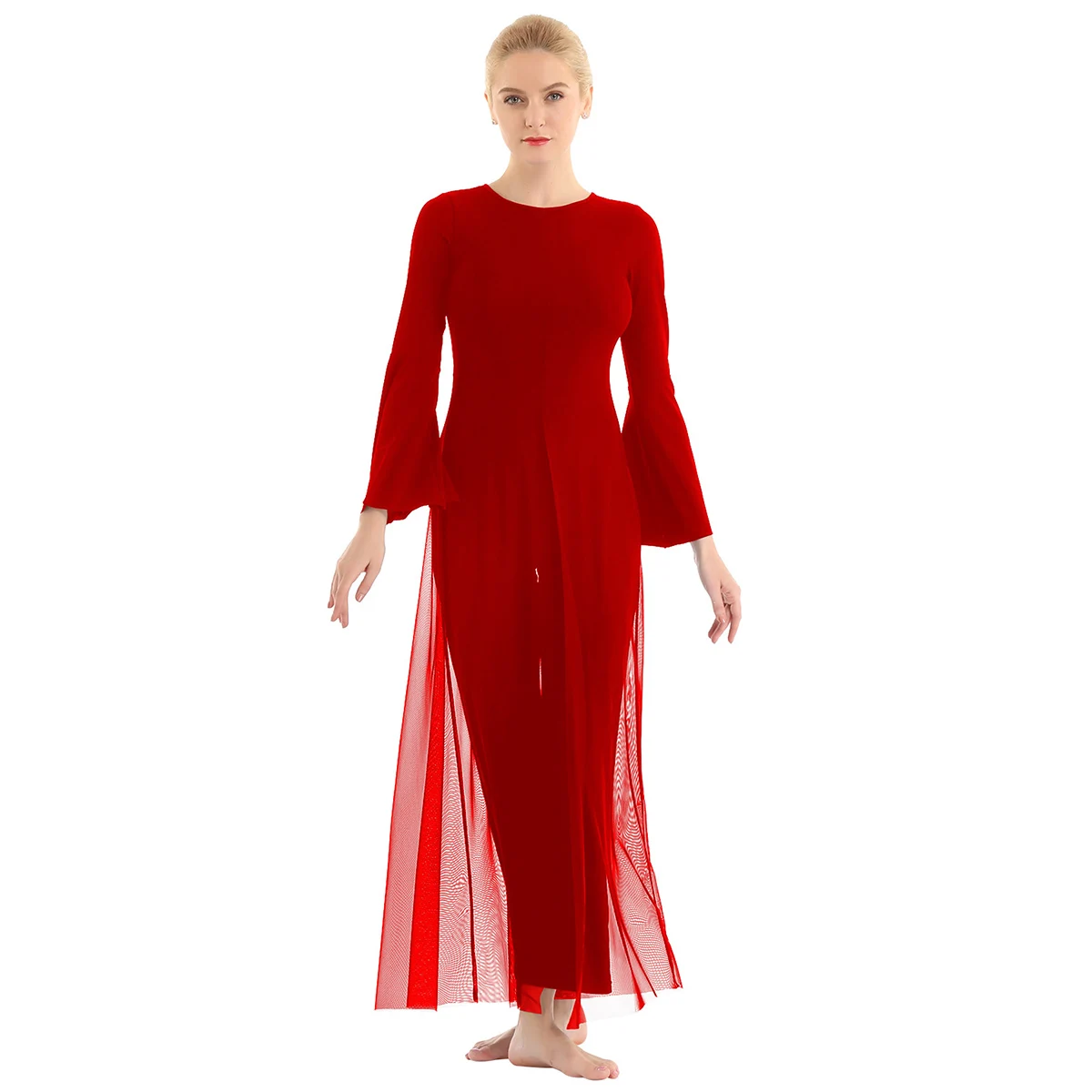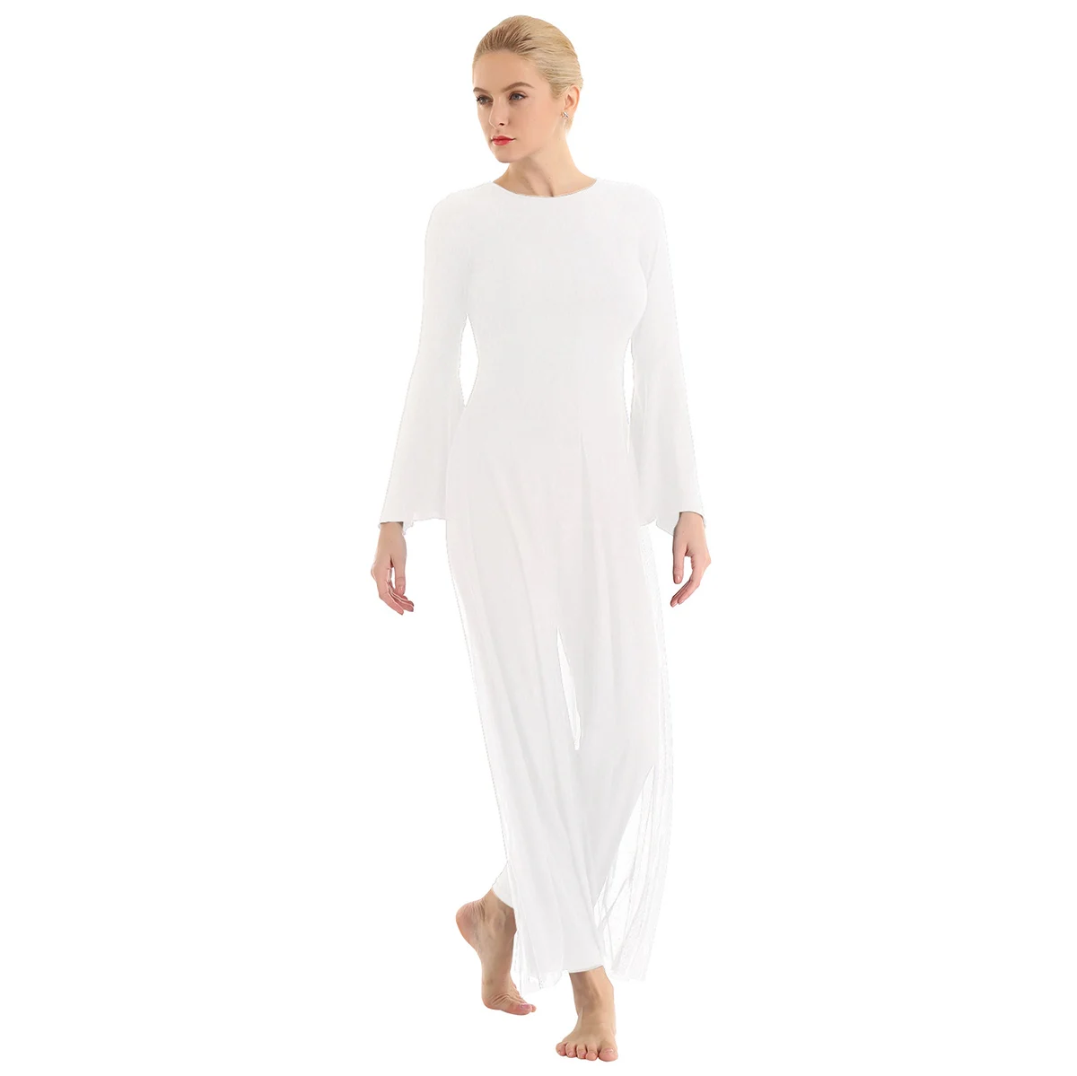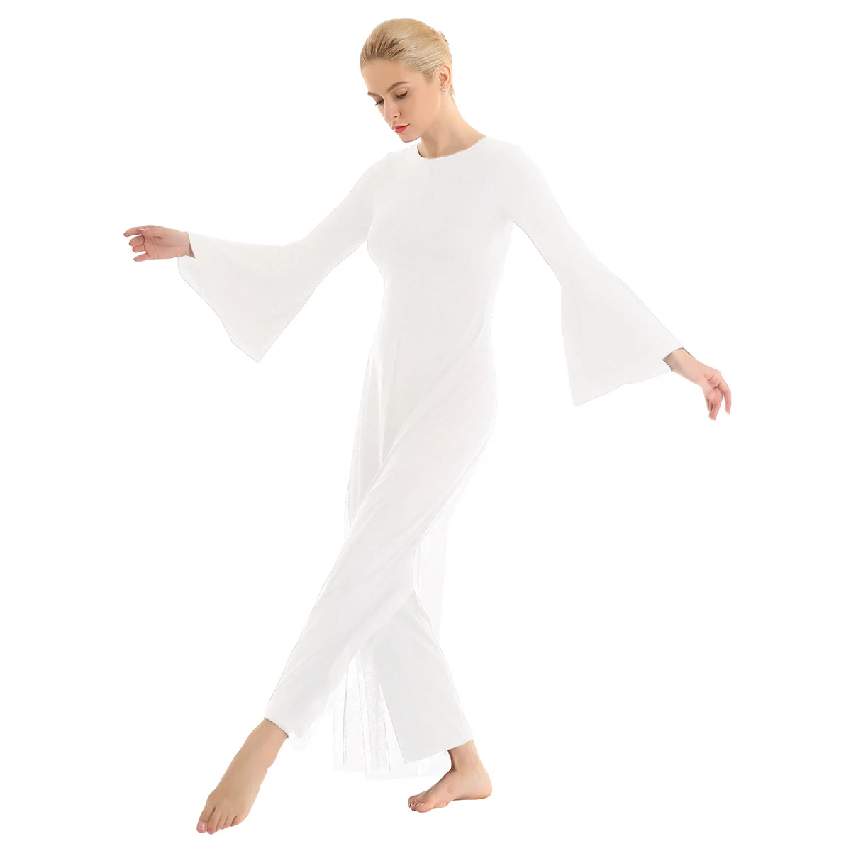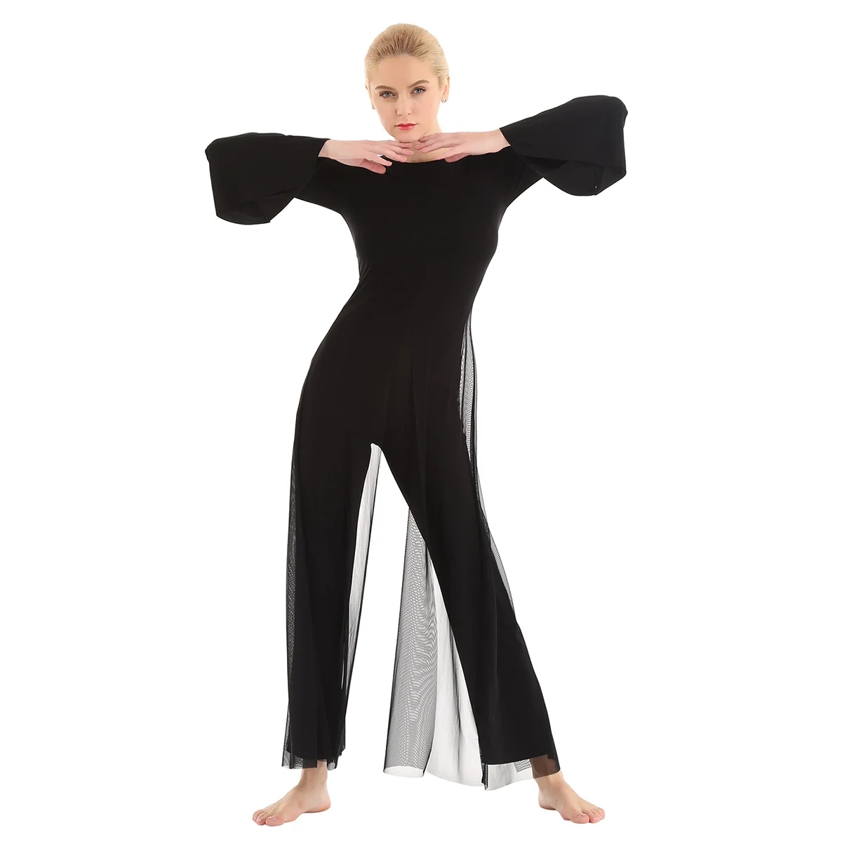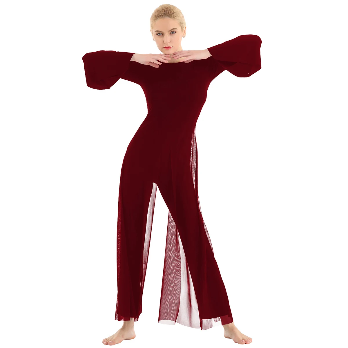 Женский взрослый Лирический танцевальный купальник-комбинезон, хорошая эластичная ткань, скрытая застежка-молния сзади. Круглый вырез, длинные расклешенные рукава и широкие ноги, Верхний сетчатый слой, полный комбинезон с разрезом спереди и сзади. Длина в пол для элегантного образа, очень очаровательный и цветочный, когда вы танцуете. Пропускающее воздух, мягкое и удобное в носке изделие. Подходит для лирического танца или классического танца, танцевальных упражнений, соревнований и выступлений и т. д. Пожалуйста, проверьте информацию о размере перед покупкой, рекомендуется ручная стирка, машинная стирка.