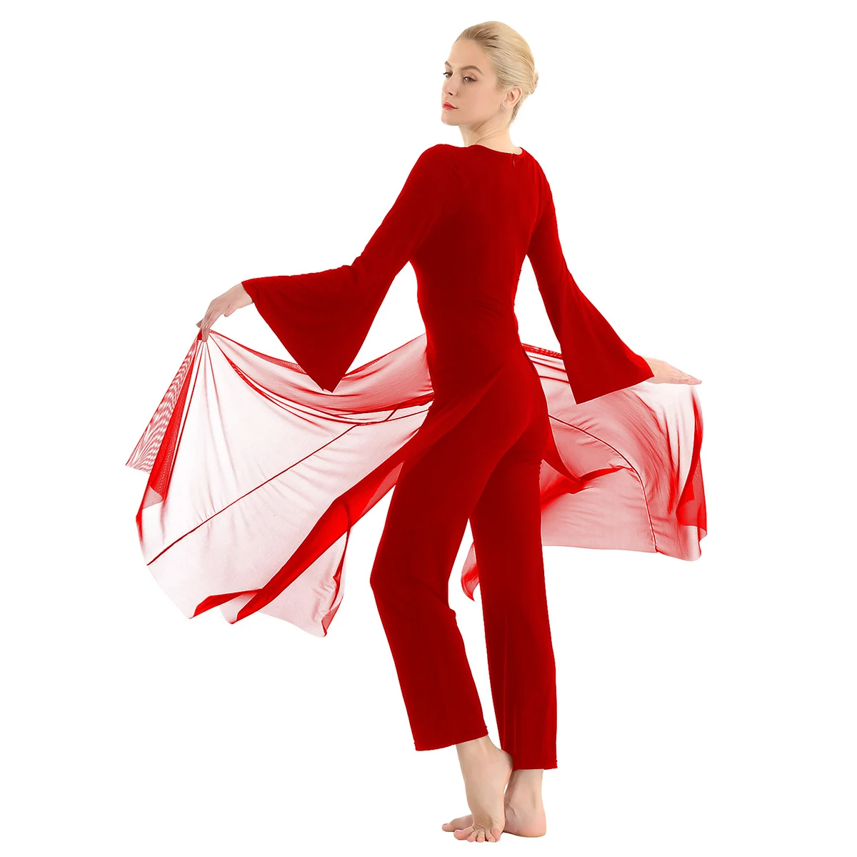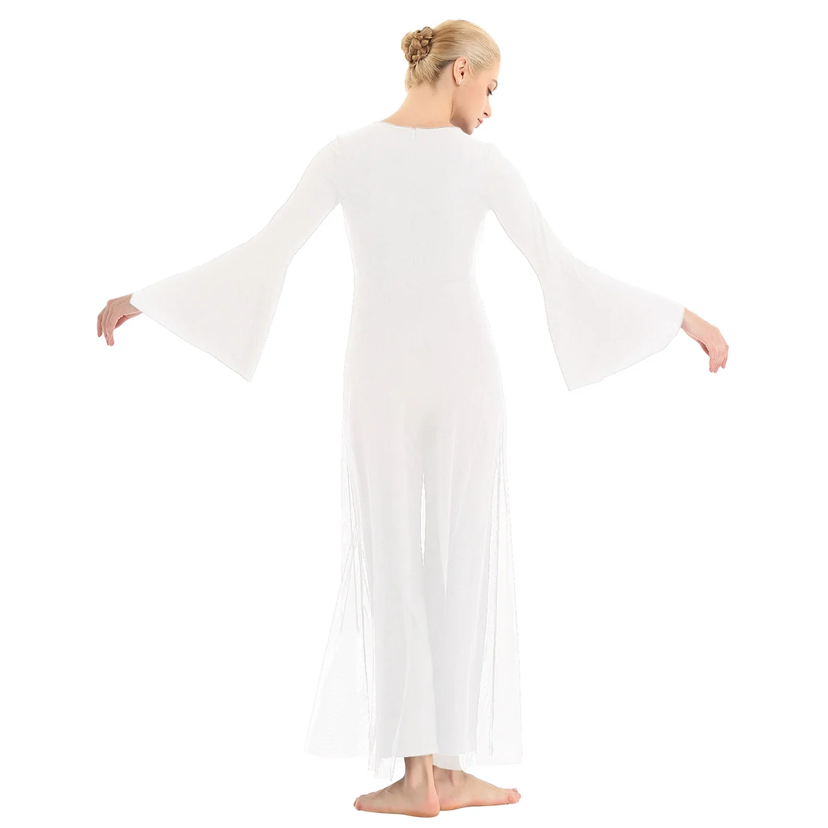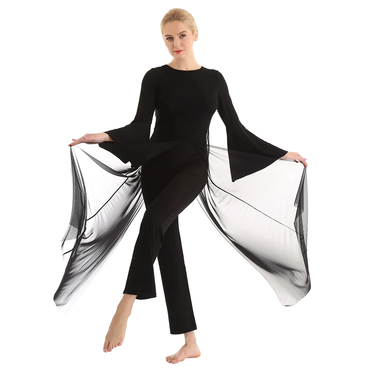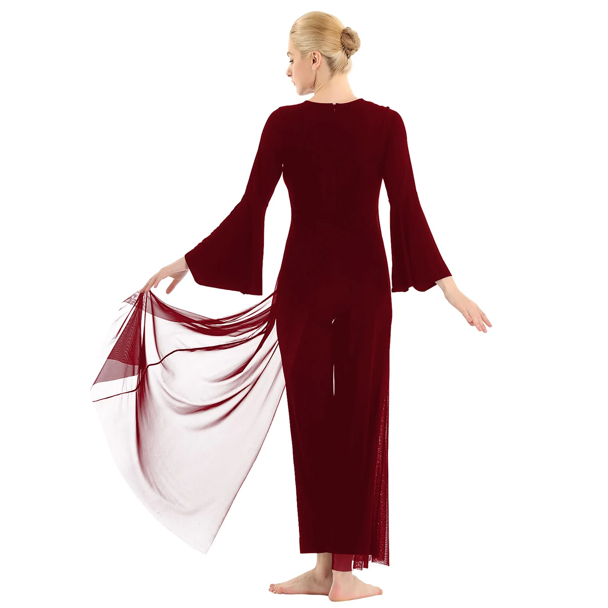 Женский взрослый Лирический танцевальный купальник-комбинезон, хорошая эластичная ткань, скрытая застежка-молния сзади. Круглый вырез, длинные расклешенные рукава и широкие ноги, Верхний сетчатый слой, полный комбинезон с разрезом спереди и сзади. Длина в пол для элегантного образа, очень очаровательный и цветочный, когда вы танцуете. Пропускающее воздух, мягкое и удобное в носке изделие. Подходит для лирического танца или классического танца, танцевальных упражнений, соревнований и выступлений и т. д. Пожалуйста, проверьте информацию о размере перед покупкой, рекомендуется ручная стирка, машинная стирка.