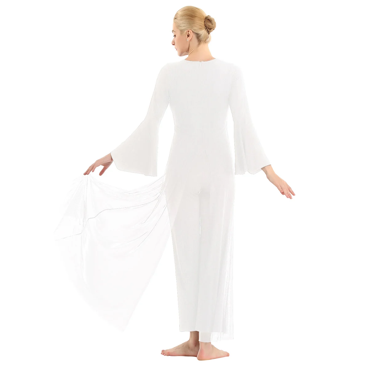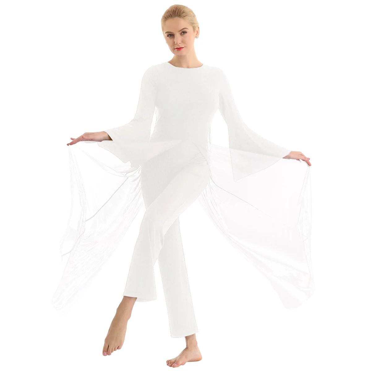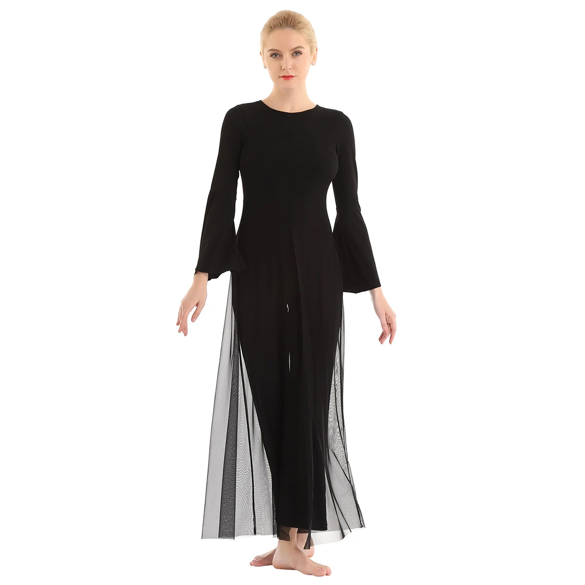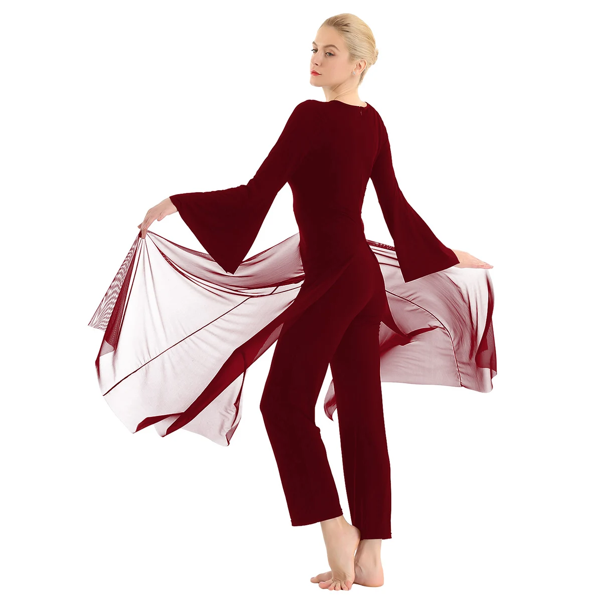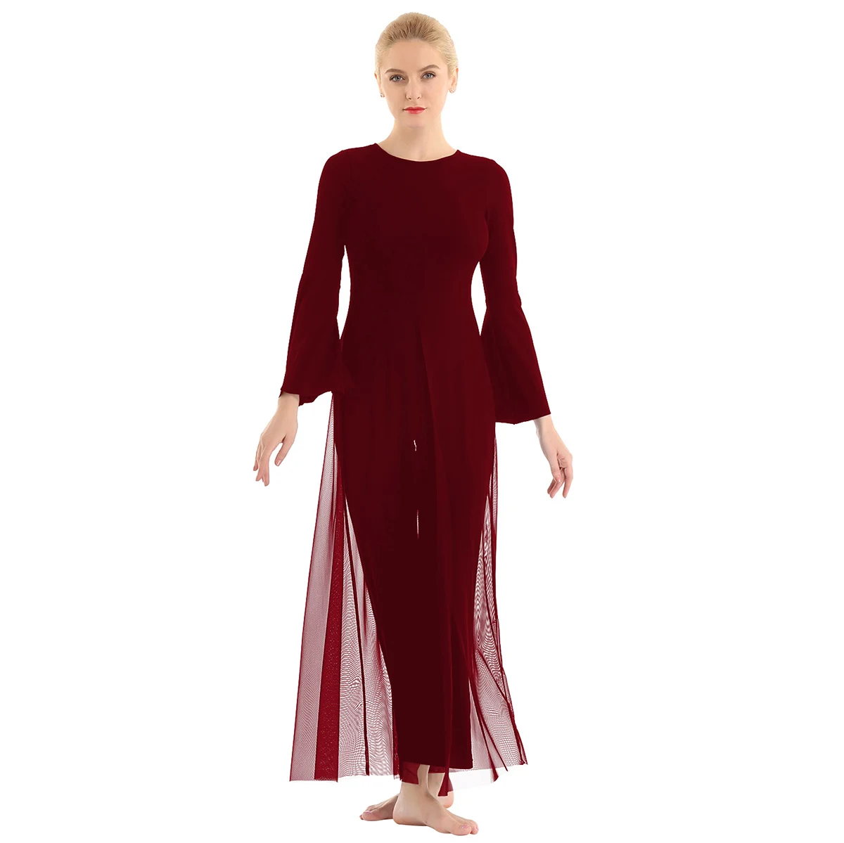 Женский взрослый Лирический танцевальный купальник-комбинезон, хорошая эластичная ткань, скрытая застежка-молния сзади. Круглый вырез, длинные расклешенные рукава и широкие ноги, Верхний сетчатый слой, полный комбинезон с разрезом спереди и сзади. Длина в пол для элегантного образа, очень очаровательный и цветочный, когда вы танцуете. Пропускающее воздух, мягкое и удобное в носке изделие. Подходит для лирического танца или классического танца, танцевальных упражнений, соревнований и выступлений и т. д. Пожалуйста, проверьте информацию о размере перед покупкой, рекомендуется ручная стирка, машинная стирка.