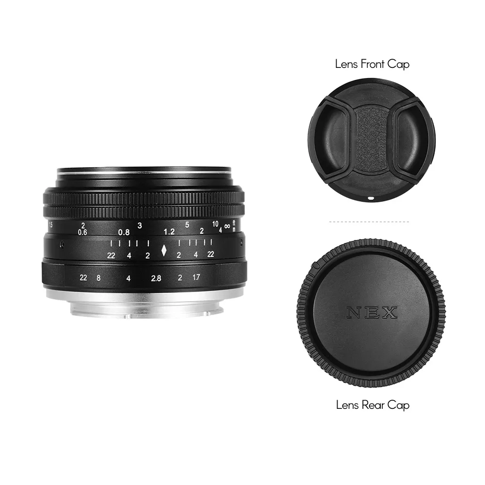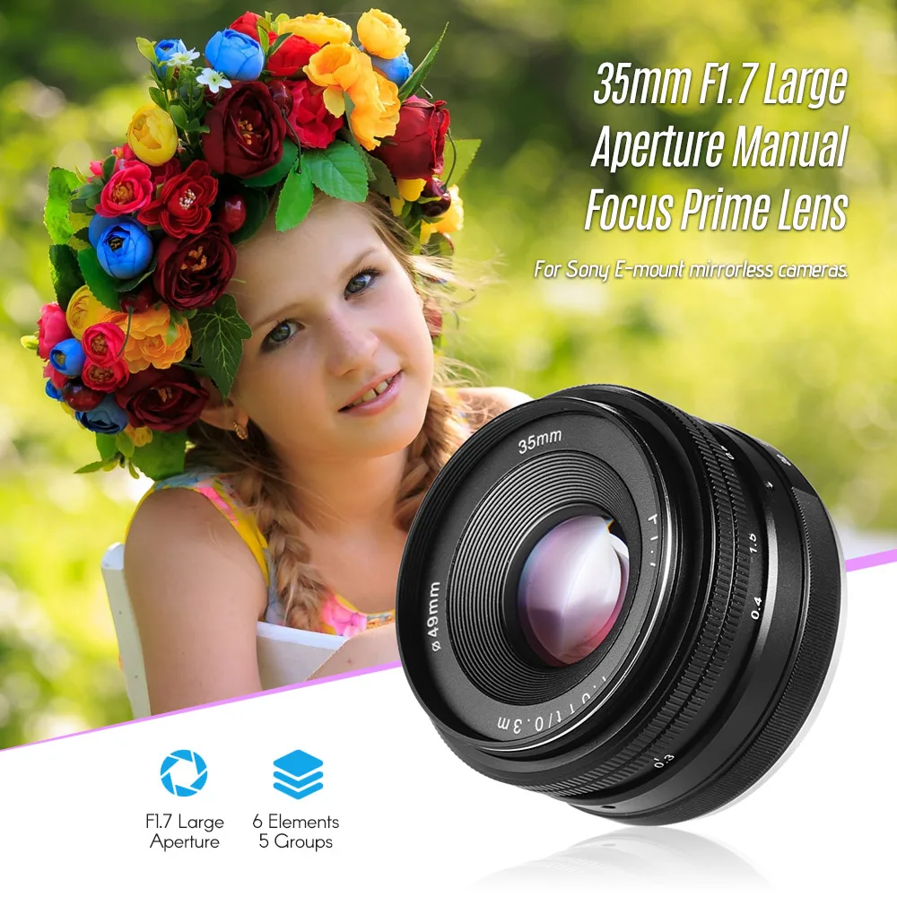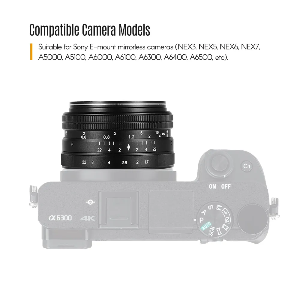 Фокусное расстояние 35 мм, беззеркальный объектив с большой апертурой f/1,7, подходит для беззеркальных камер Sony с E-mount (NEX3, NEX5, NEX6, NEX7, A5000, A5100, A6000, A6100, A6300, a6400, A6500 и др.).