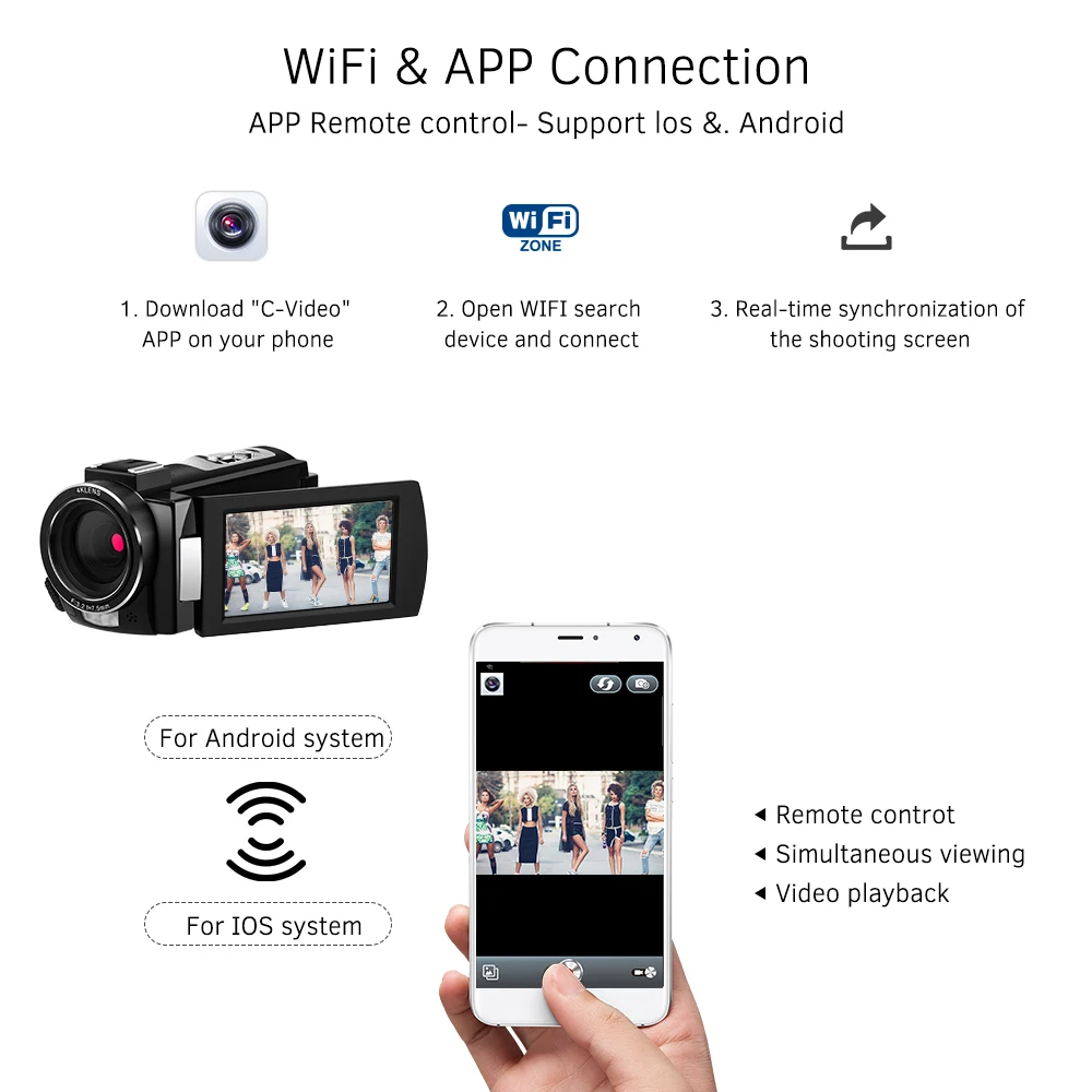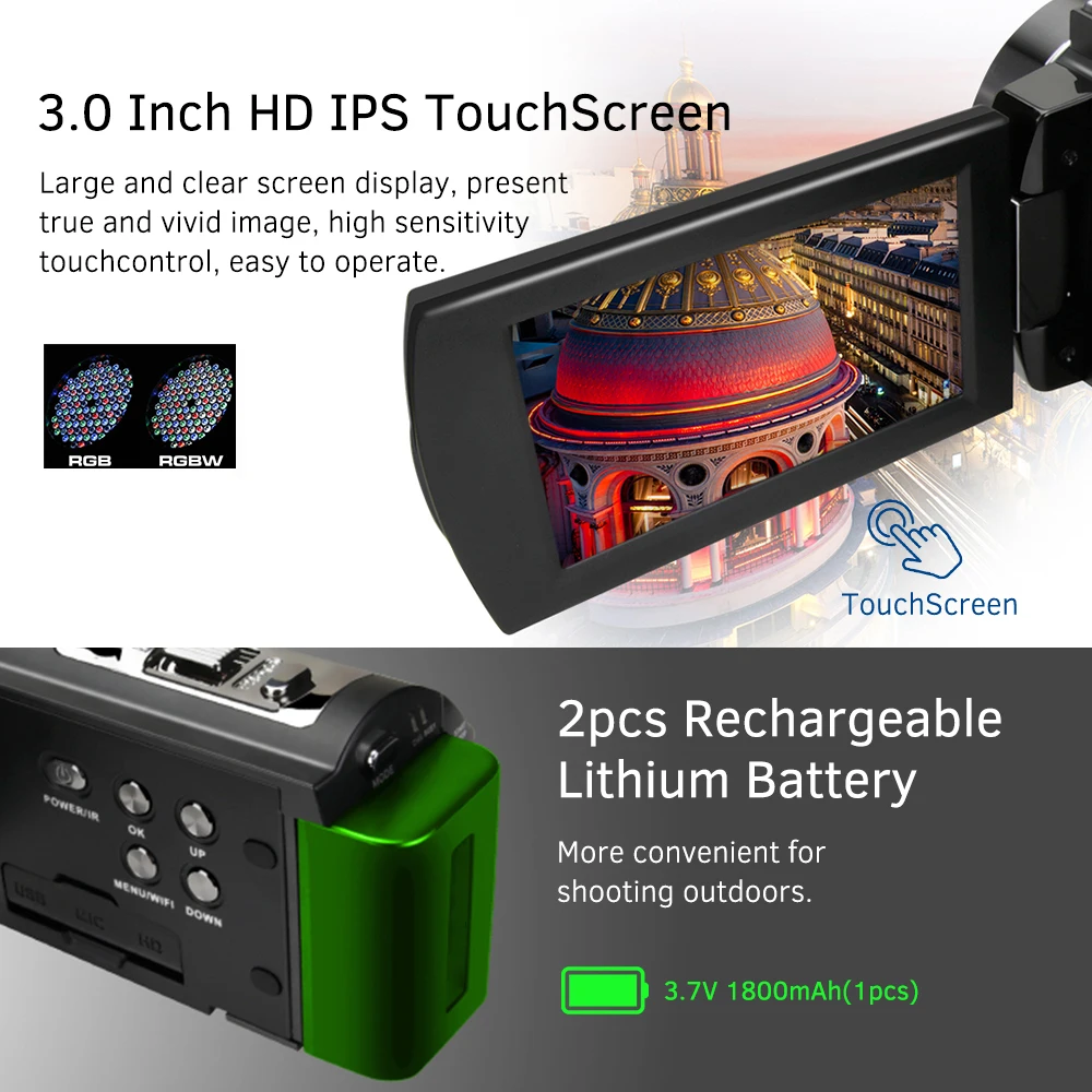 3,0 дюймовый IPS LCD сенсорный экран, очень удобный в эксплуатации, вращающийся на 180 ° дизайн экрана для селфи и групповой съемки; Поддержка профессиональной записи ИК ночного видения, он может выполнять естественное изображение высокой четкости в темной среде.