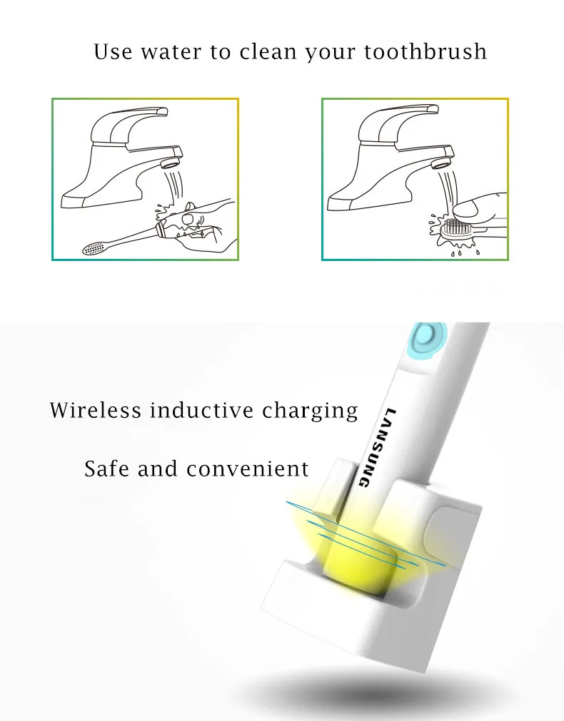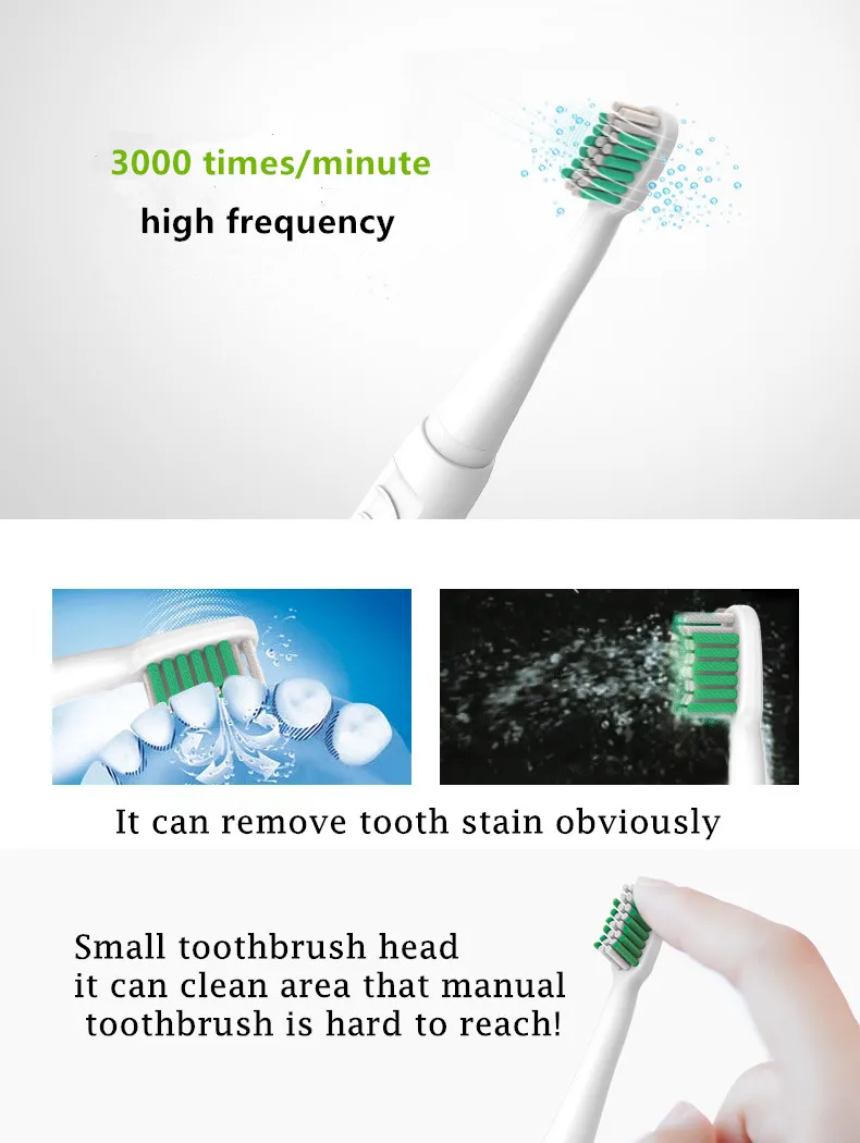 1. Описание: Название: ультразвуковая зубная щетка Lansung A39 Plus Материал головки зубной щетки: головки зубной щетки DuPont Мощность: 220 В(У нас нет 110 В, пожалуйста, учтите это) Водонепроницаемый: IPX7 Децибел менее 55 дБ, очень тихий Щетина шок качели: 30000 уд/мин Источник питания: Беспроводная Индуктивная зарядка Время зарядки: 15 часов Время работы: 50 раз/2 минуты 2. Преимущества: В 6 раз чище, чем ручная Чистка Головка зубной щетки DuPont из США, удобная, не наносящая вреда зубам 3 года, дизайн с передовой технологией Массажная электрическая зубная щетка, наслаждайтесь чисткой зубов. 3. Посылка: Ручка зубной щетки * 1 Головка зубной щетки * 4 Зарядное устройство * 1 Примечание: в качестве подарка мы можем отправить адаптер с вилкой Стандарта ЕС, Австралии, США или Великобритании. Если вам нужно, пожалуйста, оставьте нам сообщение о вашей вилке. Заранее спасибо.