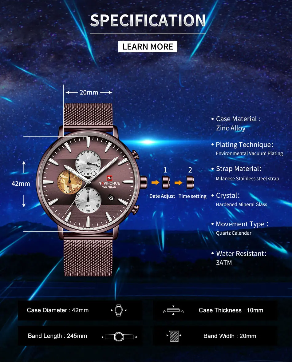 Нижнее белье высокого качества с ремешком -Чехол Материал: нержавеющая сталь -Материал ремешка: высокое качествоРемень Технические характеристики -Материал корпуса: сплав -Чехол Диаметр: 42 мм -Чехол Толщина: 10 мм -Длина ремешка: 245 мм (чехол в комплекте) -Ширина ремешка: 20 мм Что входит в комплект 100% NAVIFORCEНовый бренд 1 x аналоговые модные спортивные мужские часы