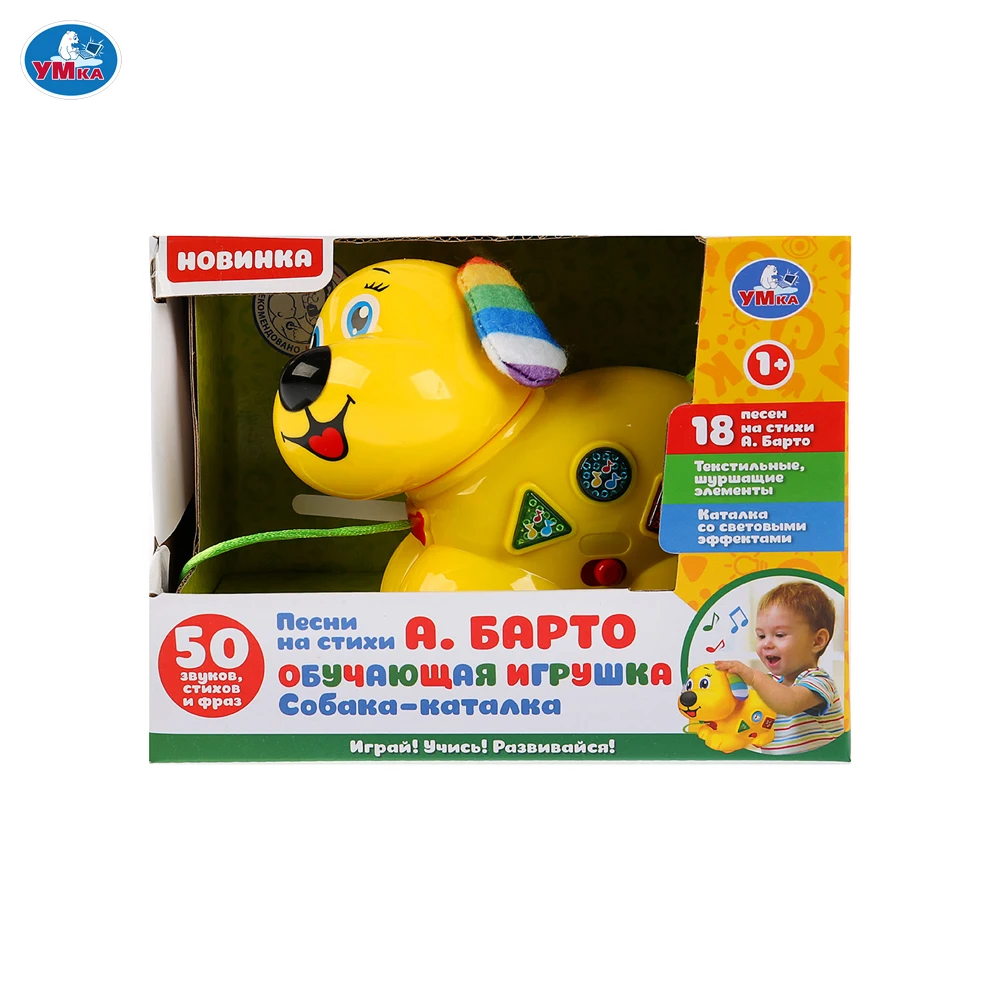 Умный пёсик будет помогать вашему ребёнку развиваться быстрее и расти самым умным и весёлым – ваш ребёнок будет с удовольствием брать его повсюду с собой на прогулки, играть, гулять и вместе петь весёлые и поучительные стихи Агнии Барто.
