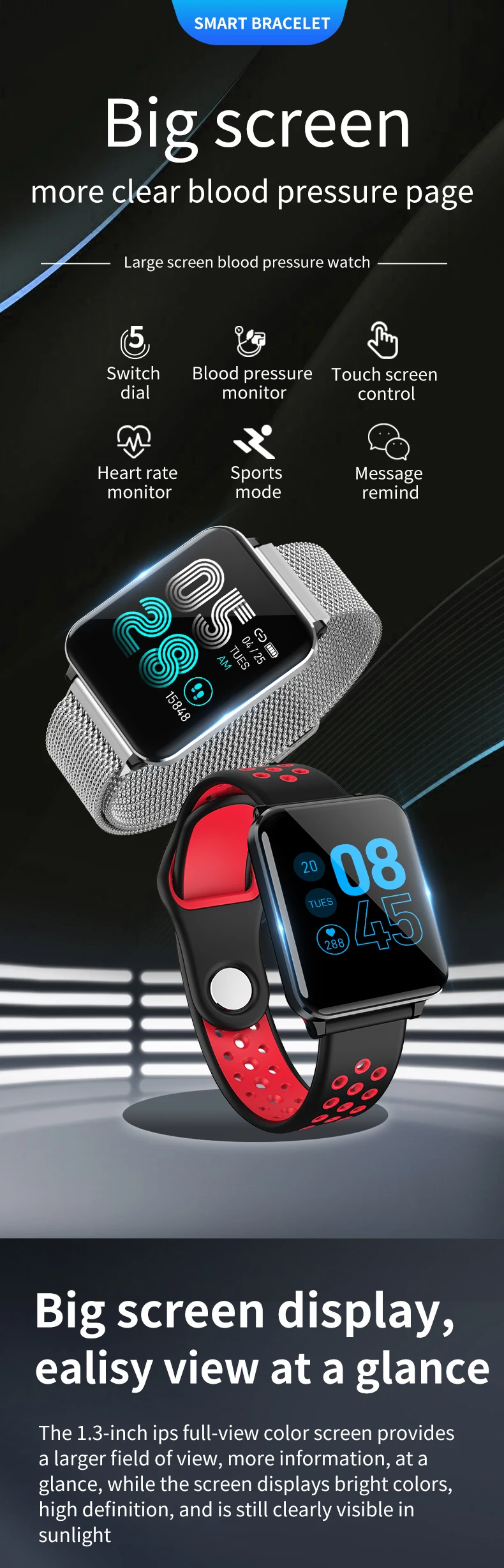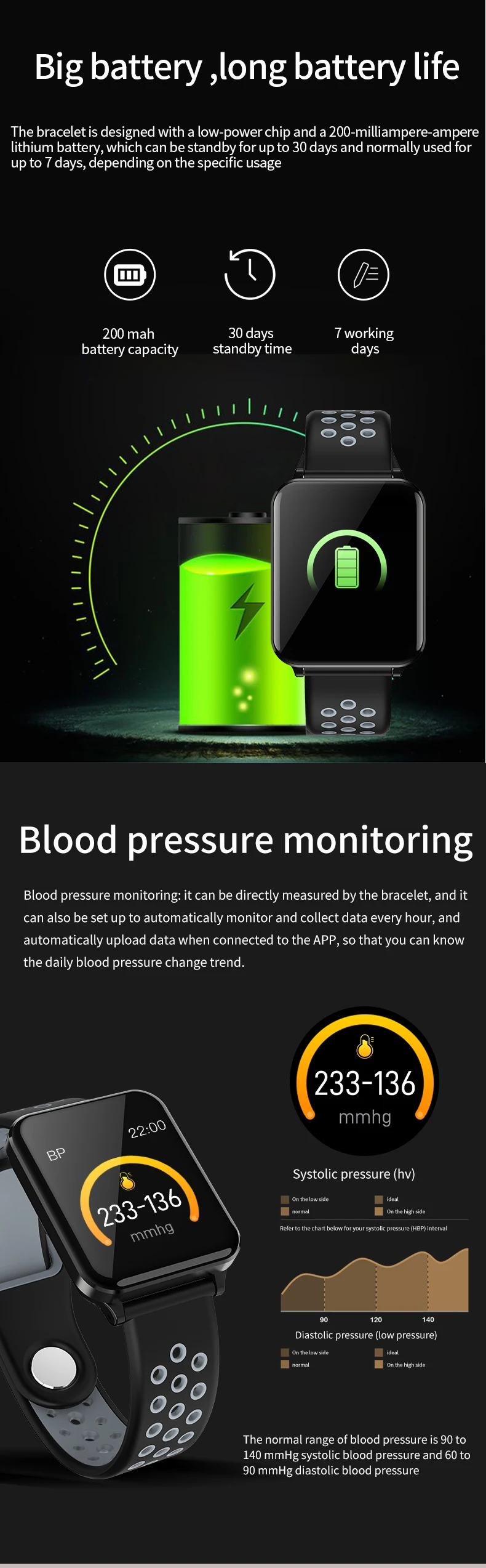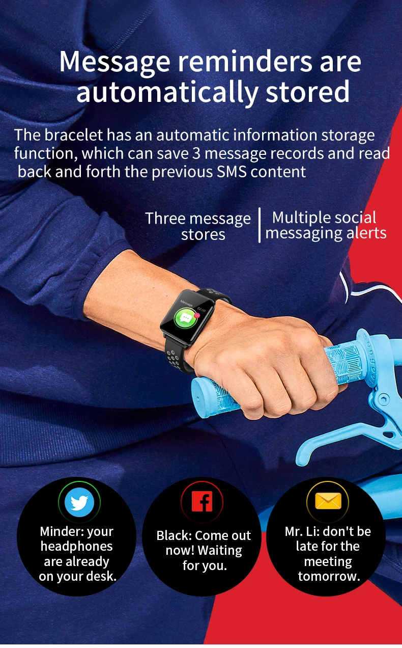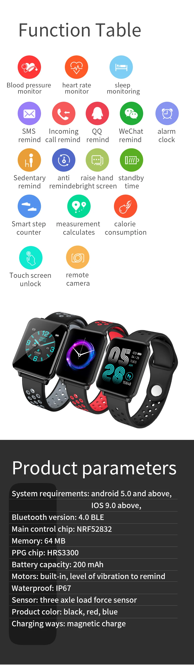 Особенности: 1. Пульс и кровяное давление (Интегральный мониторинг сердечного ритма). 2. Отображение времени/часов, подсчет шагов, калории, расстояние, время сна, секундомер, мобильный телефон, регулировка яркости, выбор 5 циферблатов. 3. Стандартная спортивная функция (подсчет шагов, расстояние, калории) мульти-спортивный режим (альпинизм, прогулки, баскетбол, бег, настольный теннис, Велоспорт, плавание, бадминтон, футбол). 4. Мониторинг сна (время сна, качество сна, время ожидания). 5. Напоминание о звонках, SMS напоминание, QQ напоминание, Wechat напоминание, Skype, Facebook, whatsApp напоминание. (Сохраните 3 записи истории сообщений). 6. Найдите мобильные телефоны, браслеты, секундомеры. 7. Будильник/лекарство/встречи/сидячий/питьевой воды напоминание. 8. Траектория gps. 9. Регулировка яркости экрана. 10. Удаленная фотография (встряхните, чтобы сделать фото). 11. Движение членов семьи и друзей, взаимная проверка данных измерений. Технические характеристики: Экран: 1,3 дюймов ips цветной экран Разрешение 240*240 Системные требования: Android 5,0 или выше, iOS 9,0 или выше Версия Bluetooth: BLE 4,0 Главный чип управления: NRF52832 Память: 64 Мб Чип PPG: HRS3300 Емкость аккумулятора: 200 мАч Мотор: встроенный, напоминание о вибрации Водонепроницаемый класс: IP67 Языки поддержки приложения: китайский (упрощенный, традиционный), японский, английский, французский, немецкий, итальянский, испанский, русский, португальский, корейский, малайзийский Язык поддержки браслета: китайский (упрощенный), английский Датчик: трехосевой датчик силы тяжести Режим зарядки: магнитная поглощающая зарядка Размер упаковки: 158*80*36 мм/6,22*3,14*1,41'' Цвет: черный, черный, красный, черный, серый