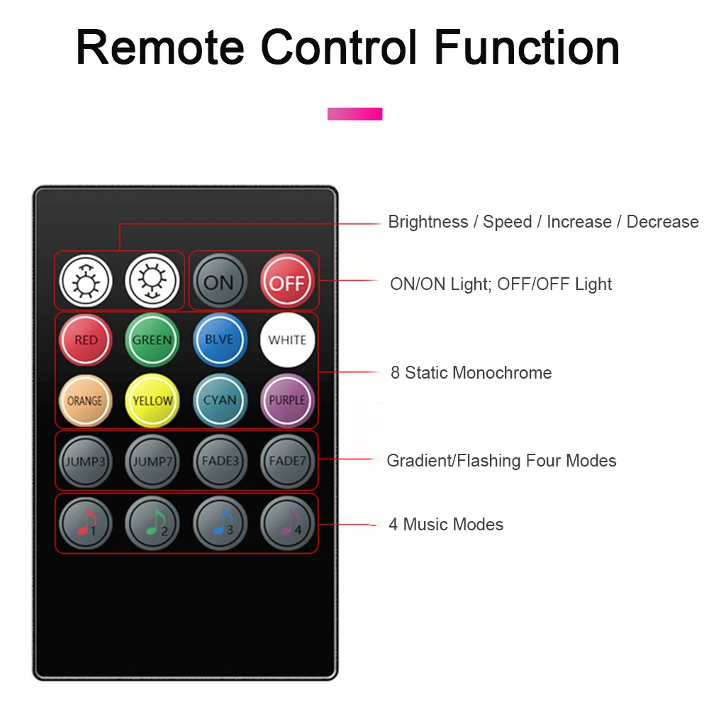Функция управления: 4 режима управления музыкой, 8 сигналов управления цветом, контроль яркости (только для монохромного), контроль скорости (только динамический режим), контроль чувствительности (только для музыкального режима), вкл/Выкл, 2 режима пропуска управления, выцветание в и ВЫКЛ 2 режима управления