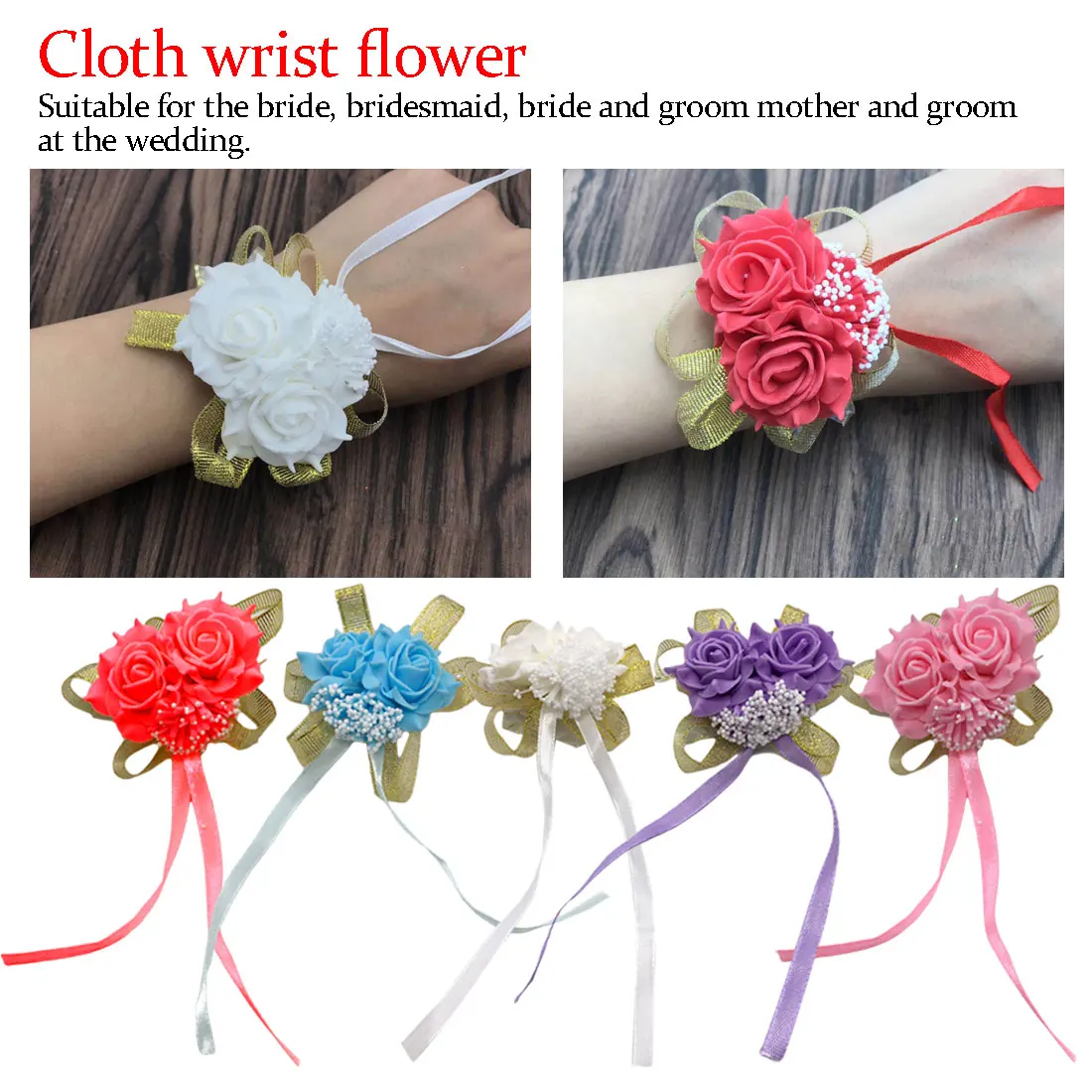 Название: свадебный цветок на запястье Размер: диаметр цветка около 6-7 см, длина ленты около 14 см Цвет: красный, розовый, синий, белый, фиолетовый Материал: Высококачественная пена + шелк + противотуманная пряжа + прозрачный эластичный браслетСпецификация B:
