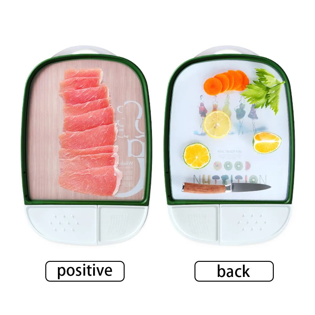 (3) Двухсторонняя доска, одна сторона для морепродуктов и мяса, одна сторона для фруктов и овощей, избегая перекрестного загрязнения.