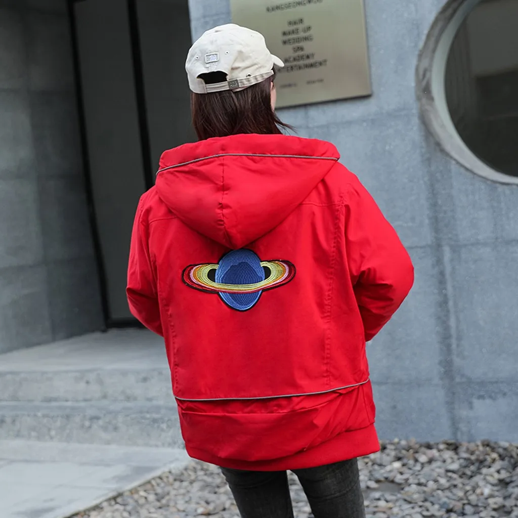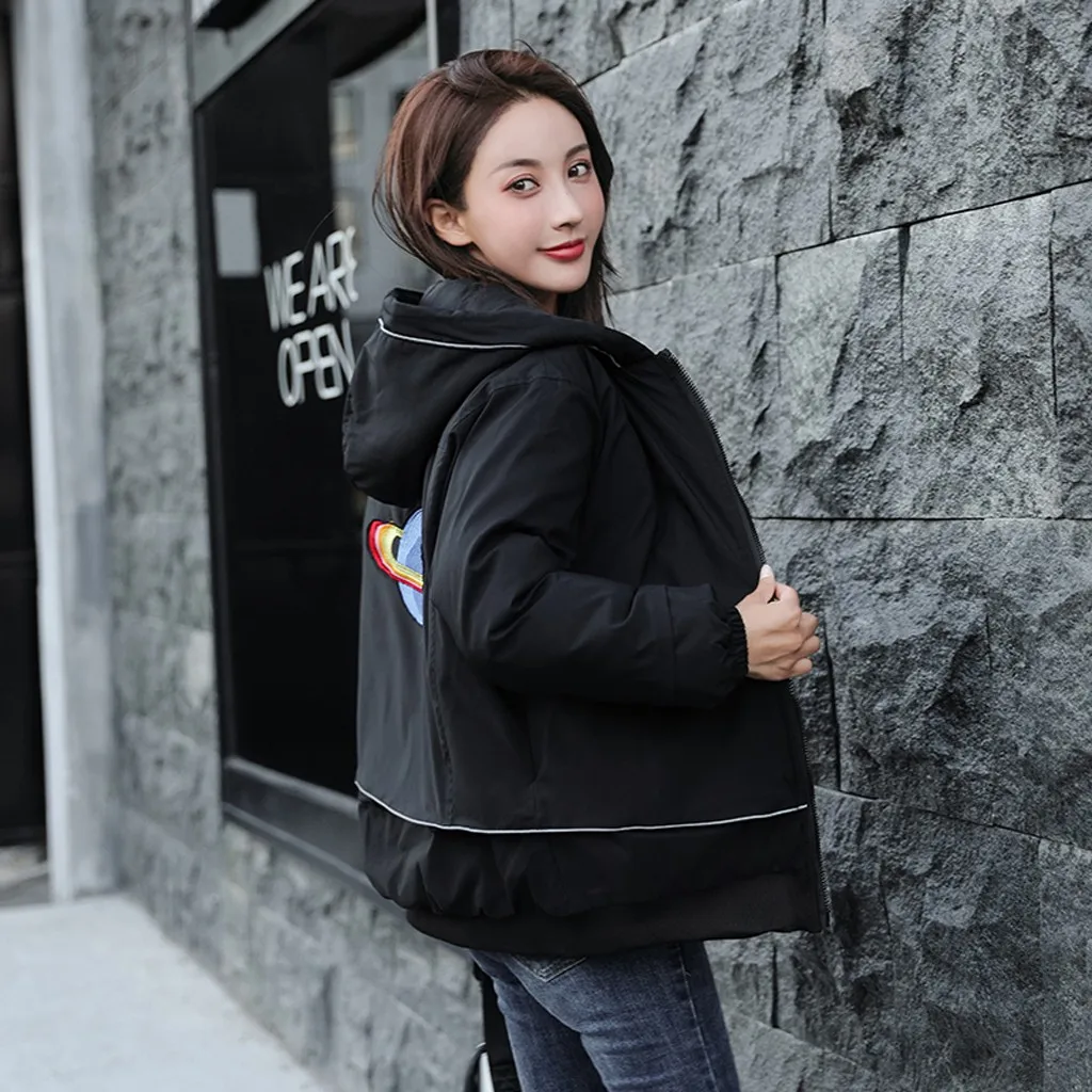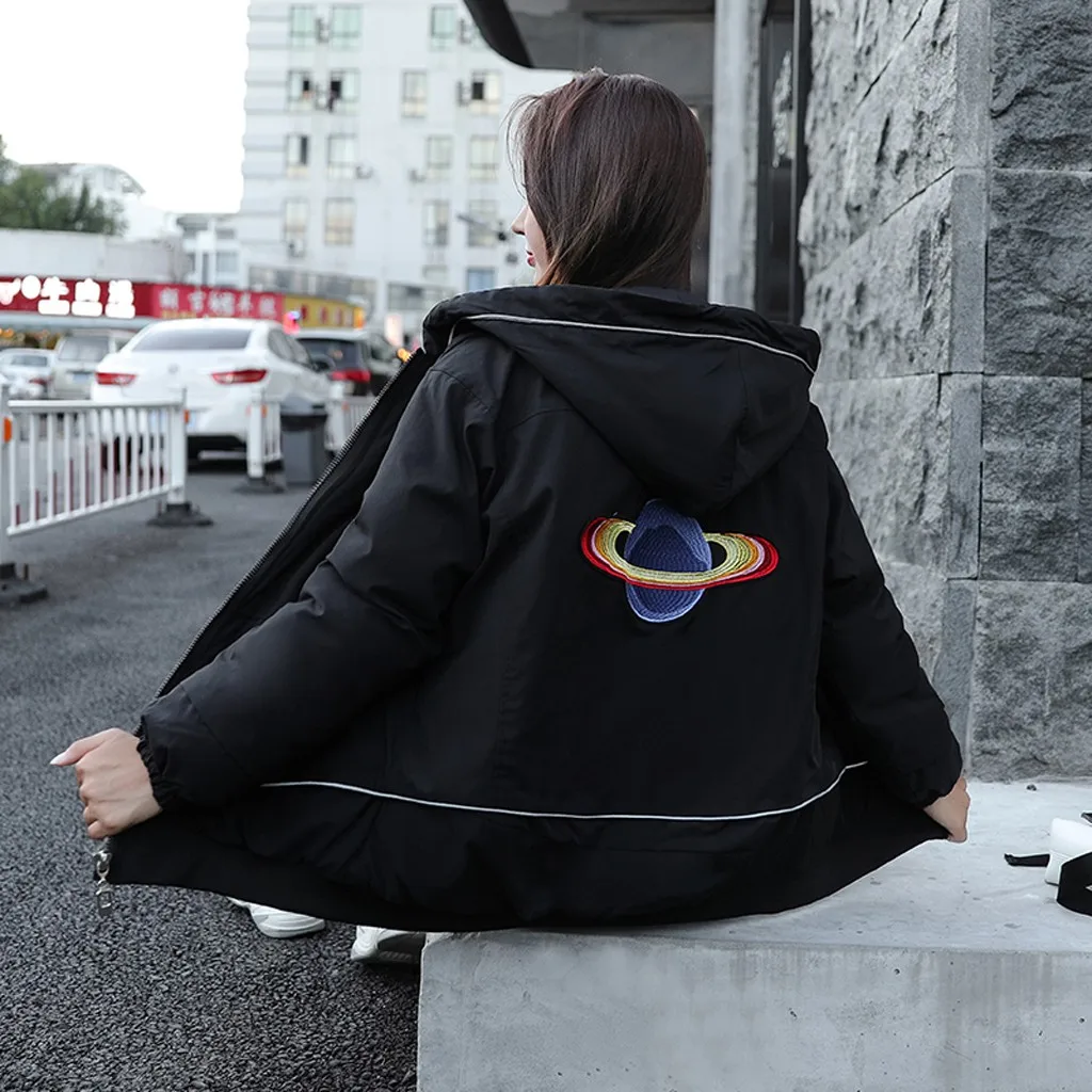 Женская модная короткая вышитая картинка на молнии с капюшоном куртка пальто с карманами