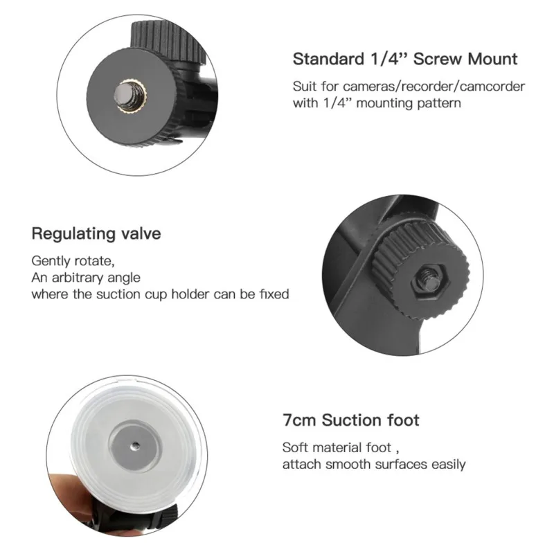 1. Легко настроить, вы можете прикрепить камеру к автомобилям, лодкам, мотоциклам и любой гладкой поверхности с помощью этого крепления на присоске, легко установить и удалить, нет необходимых инструментов, нет остатков и царапин слева, быстросъемная база делает перемещение между кадрами и местами быстрым