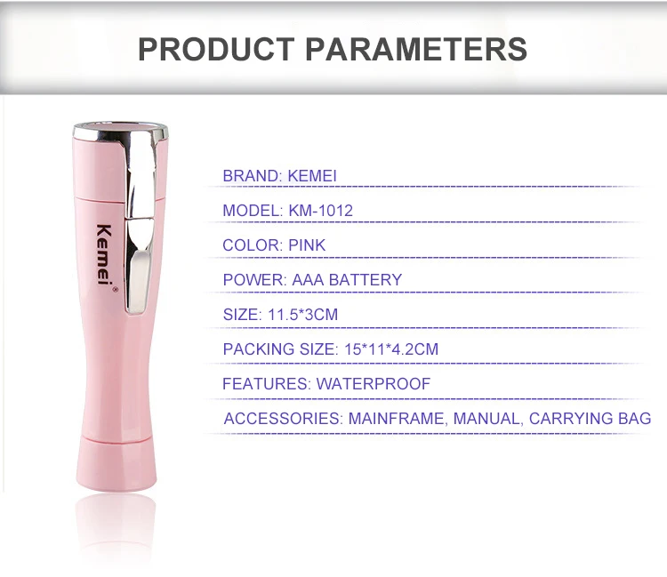 100% новинка, высокое качество! Вы можете быстро, легко и безопасно удалить лишние волосы с тела. Безопасность бритья: без вытягивания, без больших пор. Без боли, не повреждает кожу или потовые железы. Делает кожу мягкой и нежной. Маленький и легкий, простой в использовании и переноске. Идеально подходит для бритья ног, подмышек и других частей тела. Питание от 1 батарейки AA (не входят в комплект). Свойства продукта: Название бренда: No Тип проекта: эпилятор Использование: бикини, тело, лицо, нижняя часть руки Тип питания: батарея Модель: KM-1012 Спецификация: Материал: АБС Питание: 1 батарейка AA (без налогов) Цвет: розовый Размер бритвы: 11,5x2,5 см (Длина x Ширина) В комплект посылка ходит: 1 х Портативный моющийся Эпилятор электробритва для удаления волос, триммер для бикини