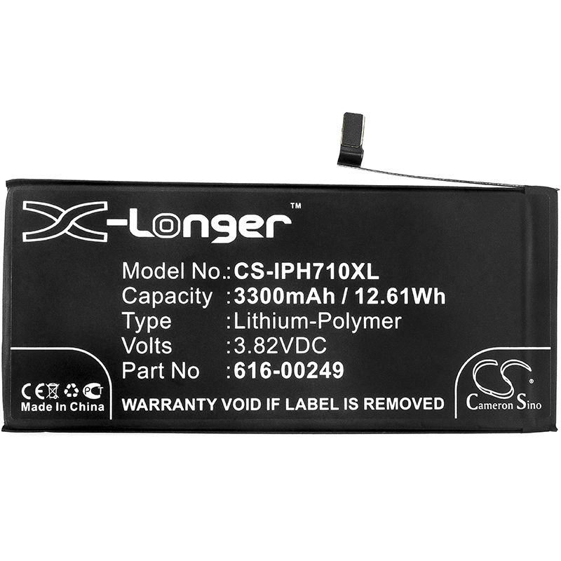 Cameron Sino Model:CS-IPH710XL Part Number : Apple 616-00249 616-00252 Compatible For: Apple A1661 A1784 A1785 A1786 iPhone 7 Plus Volts: 3.82V Type: Li-Polymer Color: Black Capacity: 3300mAh / 12.61Wh Size: 110.10 x 49.70 x 3.46mm Warranty: 12 Months