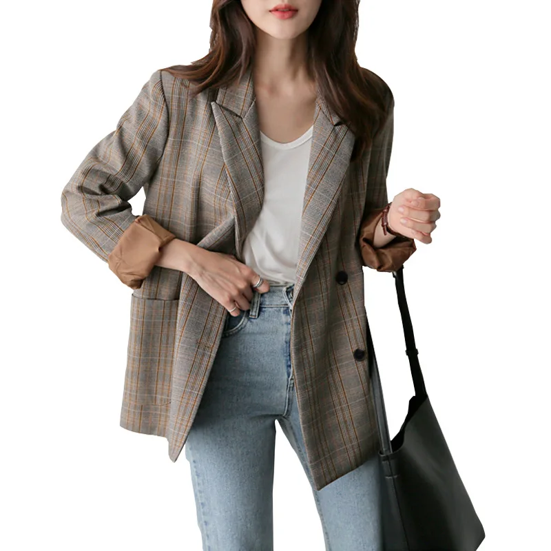 Женский двубортный пиджак, винтажный Повседневный блейзер в клетку, Новинка осени 2019, Женский офисный костюм высокого качества