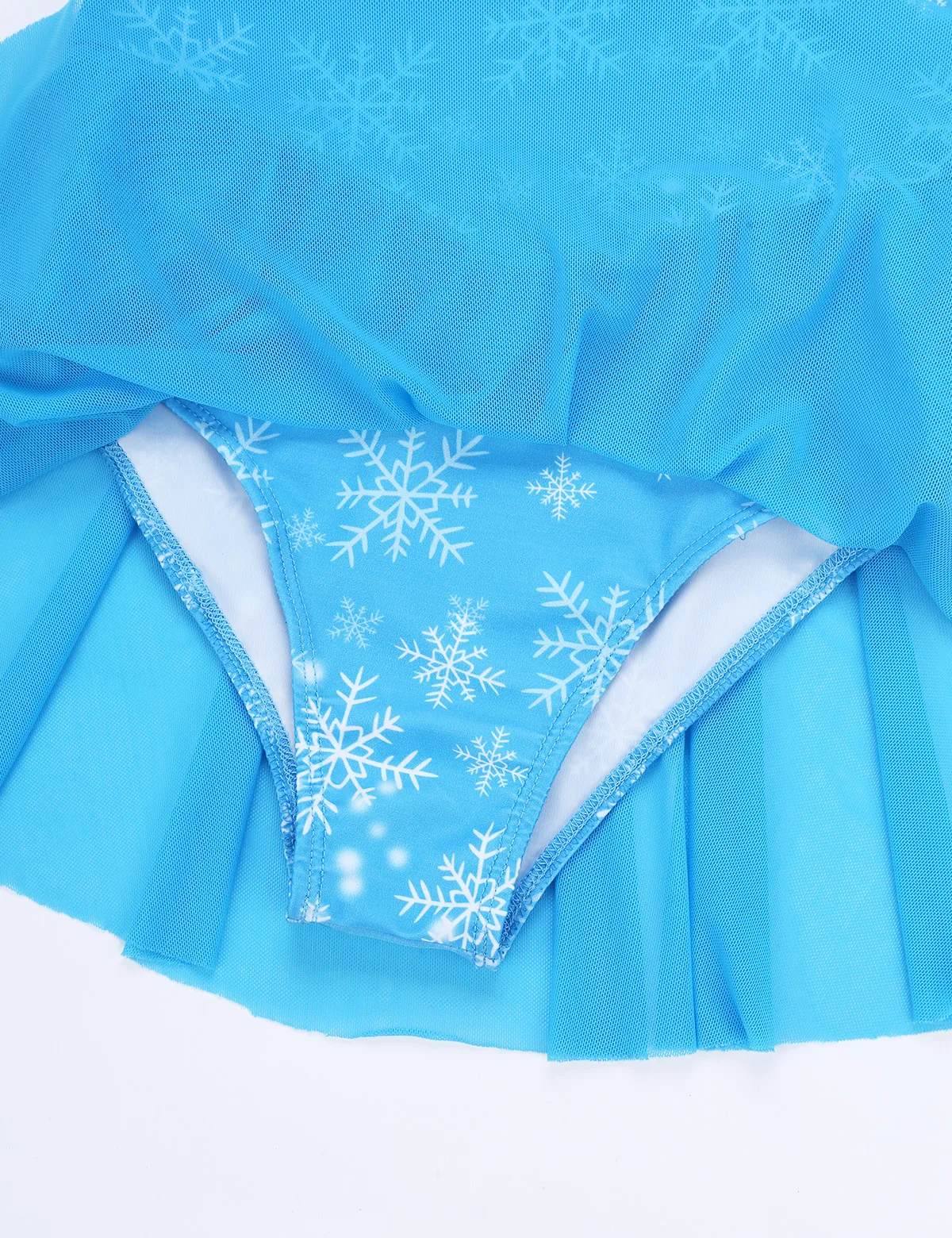 Без рукавов, круглый вырез, сетчатая кокетка спереди и сзади. Трико с принтом в виде снежинок.