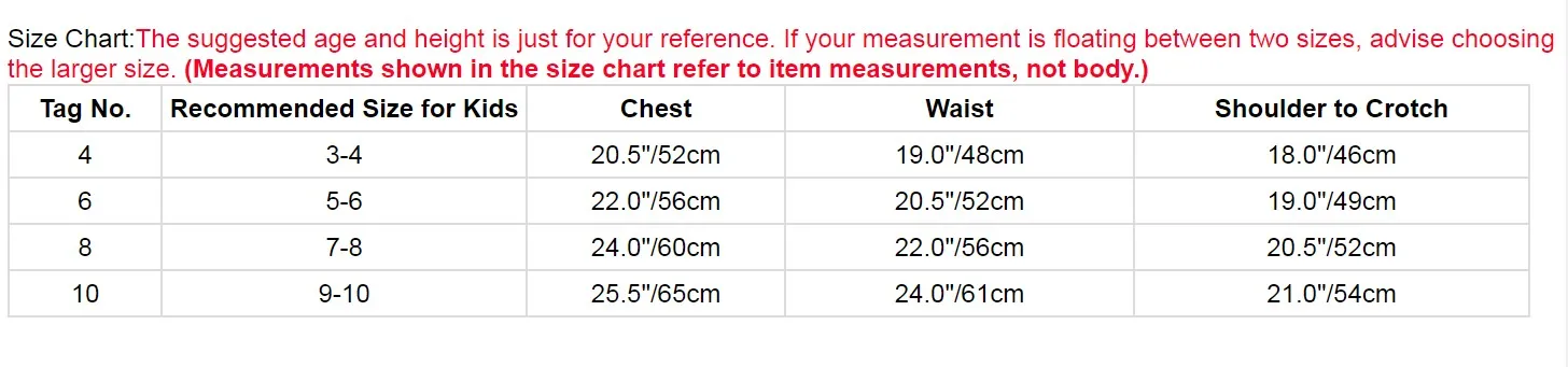Бирка № Рекомендуемый размер для детей Грудь Талия От плеча до промежности 4 3-4 20,5 "/52 см 19,0 "/48 см 18,0 "/46 см 6 5-6 22,0 "/56 см 20,5 "/52 см 19,0 "/49 см 8 7-8 24,0 "/60 см 22,0 "/56 см 20,5 "/52 см 10 9-10 25,5 "/65 см 24,0 "/61 см 21,0 "/54 см Полезные советы: Замеры делаются вручную, поэтому учитывайте небольшие погрешности. Цвет на фото может немного отличаться от реального товара из-за особенностей цветопередачи различных мониторов.