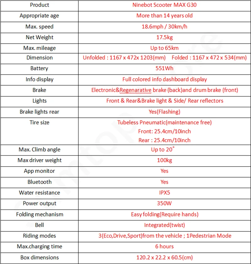 Продукт: Ninebot MAX G30 Подходящий возраст: более 14 лет Максимальная скорость: 15.5mph / 30 км/ч Вес нетто: 18 кг Макс. Пробег: до 65 км Размеры: в разложенном виде: 1167x472x1203 (мм) В сложенном виде: 1167x472x534 (мм) Аккумулятор: 551Wh Инфо-дисплей: полноцветный информационный дисплей приборной панели Тормоз: Электронный и регенативный тормоз (задний) и барабанный тормоз (передний) Светильник s: передний и задний и тормозной светильник и боковые/задние отражатели Задние тормозные огни: Да (мигание) Размер шин: 25,4 см/10 дюймов Макс. Угол подъема: до 20 ° Максимальный вес драйвера: 100 кг Водонепроницаемость: IPX5 Выходная мощность: 350 Вт Складной механизм: легко складывается (требуются руки) Звонок: интегрированный (поворот) Режимы езды: 3(Eco,Drive,Sport) от транспортного средства; 1 пешеходный режим Макс. Время зарядки: 6 часов Размеры коробки: 119,5x22,2x60,5 (см) Стандартный диапазон: Протестировано во время езды при полной мощности, нагрузка 165,3lbs (75 кг), 77 °F(25 ℃),9.3mph(15 км/ч) в среднем на тротуаре.