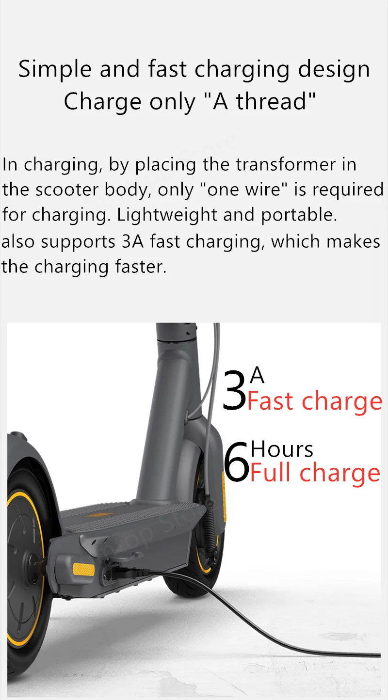 При зарядке, путем размещения трансформатора в Корпус скутера, требуется только "один провод" Для зарядки. Легкий и портативный. Также поддерживает быструю зарядку 3A, что делает Зарядка быстрее.