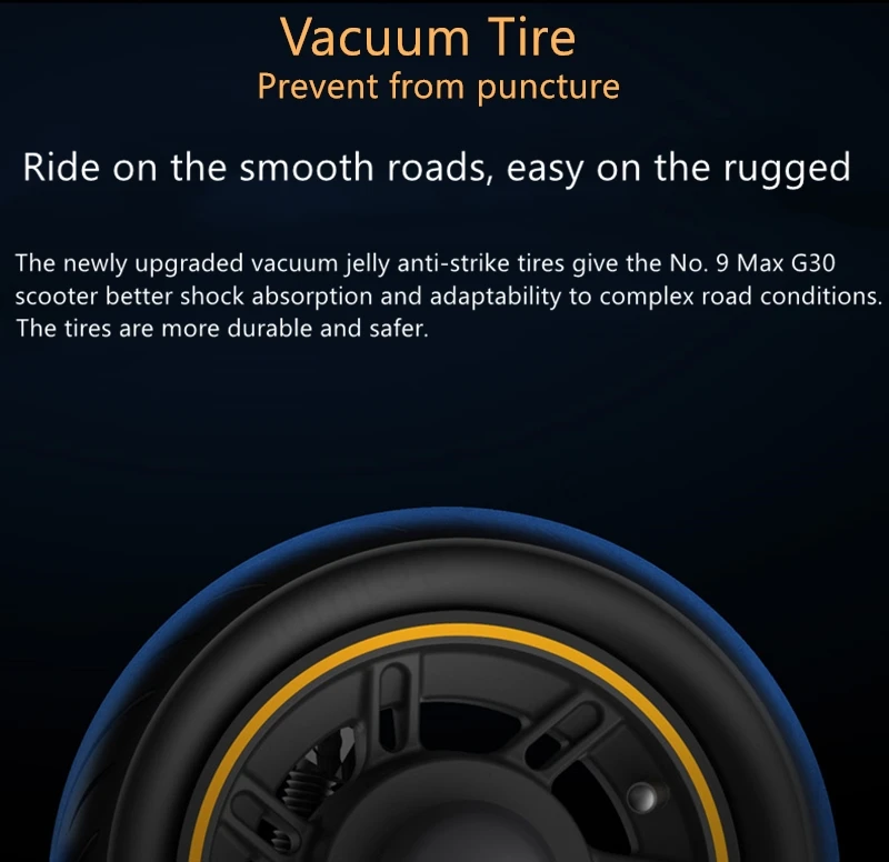 Новые усовершенствованные вакуумные jlly противоударные шины дают скутеру No. 9 Max G30 лучшее поглощение ударов и адаптируемость к сложным дорожным условиям. Шины более прочные и безопасные.