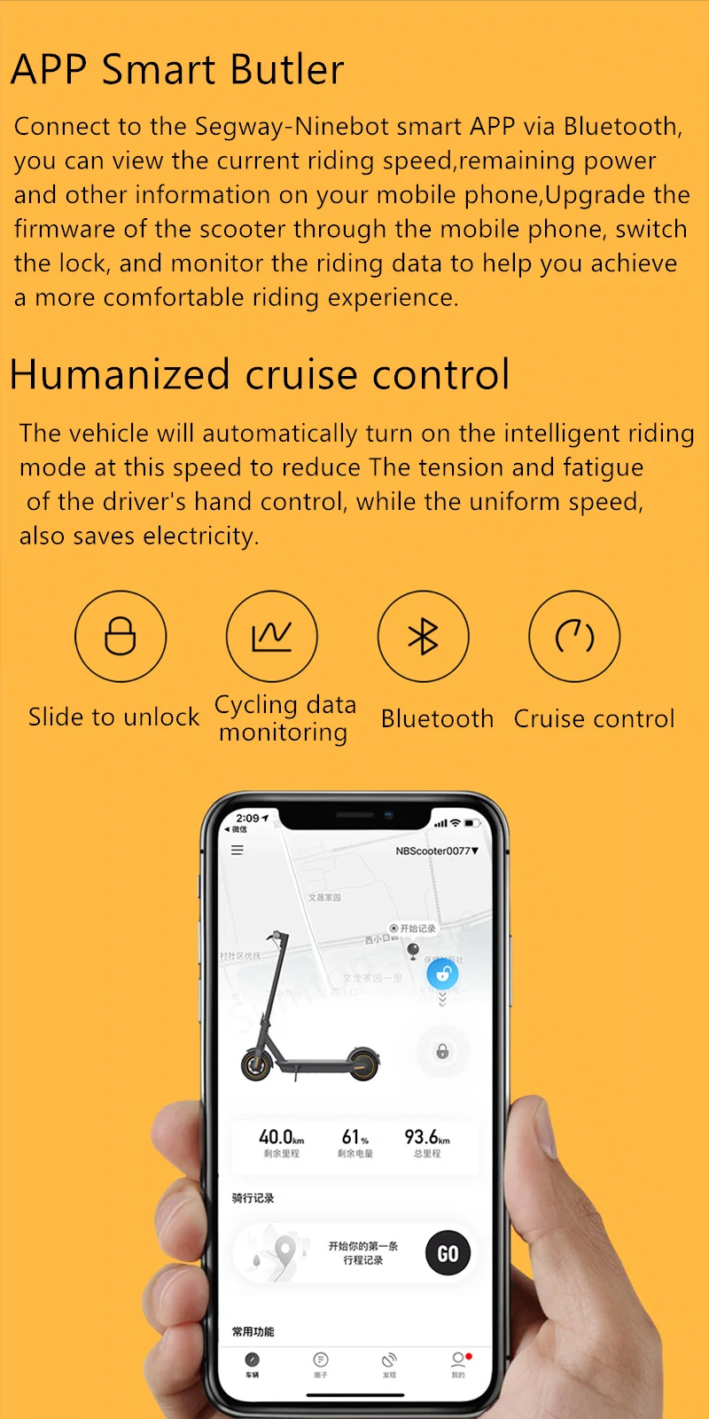 Подключайтесь к смарт-приложению Segway-Ninebot через Bluetooth, вы можете просматривать текущую скорость езды, оставшуюся мощность и другую информацию на свой мобильный телефон, обновлять прошивку скутера через мобильный телефон, переключать Блокировка и мониторинг данных о езде, чтобы помочь вам достичь более комфортного вождения.