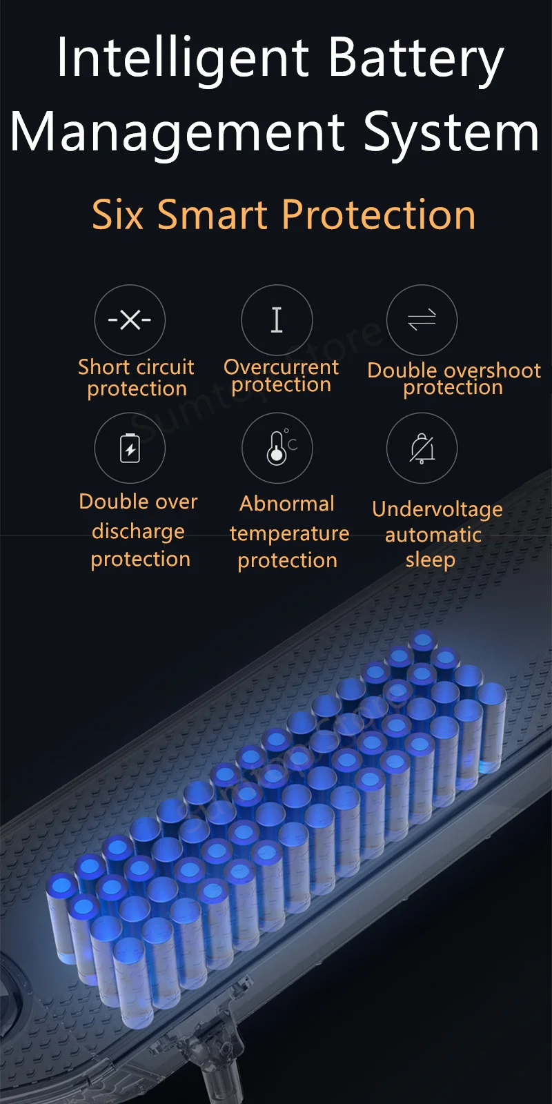 Шесть смарт-защиты 1, защита от короткого замыкания 2, защита от перегрузки по току 3, двойная защита от перегрева 4, двойная защита от разрядки 5, ненормальная защита от температуры 6. Автоматическое отключение от низкого напряжения