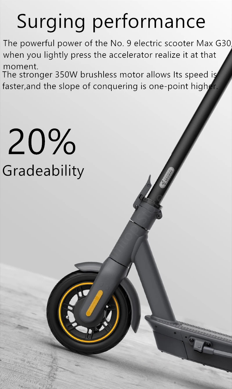Мощная мощность электрического скутера No.9 Max G30, когда вы слегка нажимаете ускоритель, поймите это в этот момент. Более мощный бесщеточный двигатель мощностью 350 Вт обеспечивает более высокую скорость, а наклон завоевания выше на одну точку.