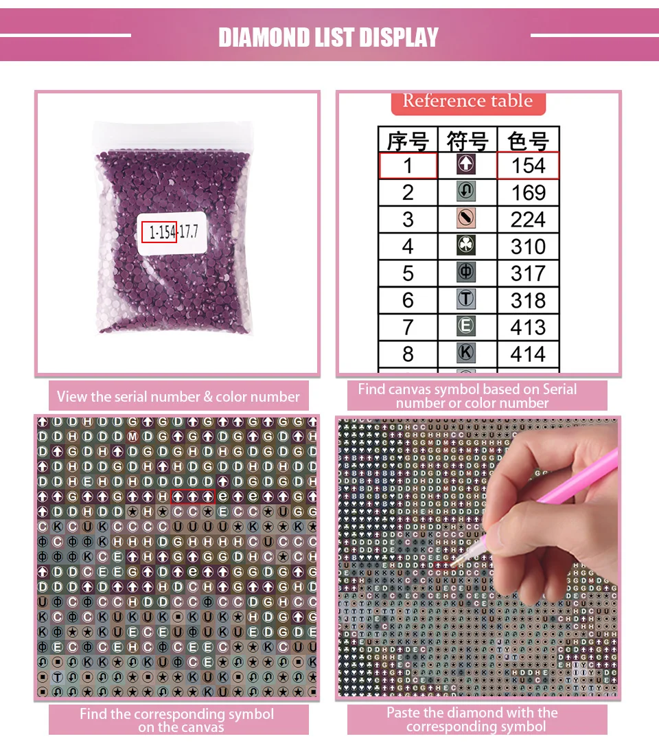 1. См. Таблицу сравнения на холсте, чтобы определить каждый номер алмаза и соответствующий номер печати на холсте.