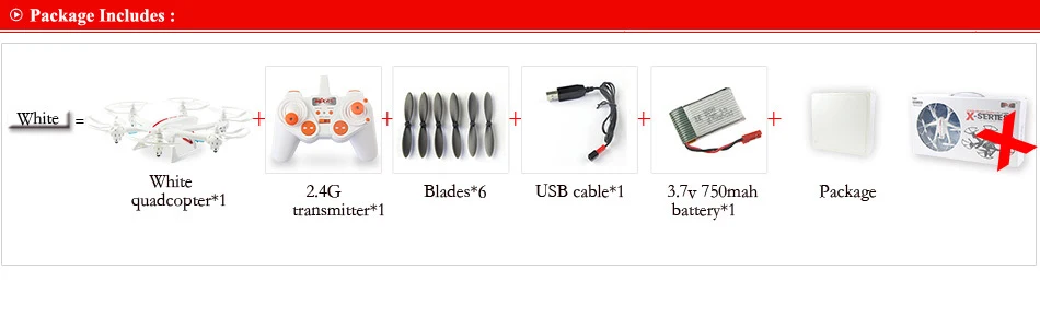 Название продукта: Квадрокоптер X800 Размер продукта: 17*19*4,5 см Диаметр лезвия: 5,6 м освещение: ночные светильники Проход: 4 Модель основного двигателя: Бессердечный двигатель Частота: 2,4 ГГц Защитный Материал: АБС-пластик Гироскоп: 6-осевой гироскоп Дистанция: 100 м Емкость аккумулятора: 3,7 в 750 мАч Время зарядки: около 120 минут Время полета: около 8-10 минут Вес: около 80 г