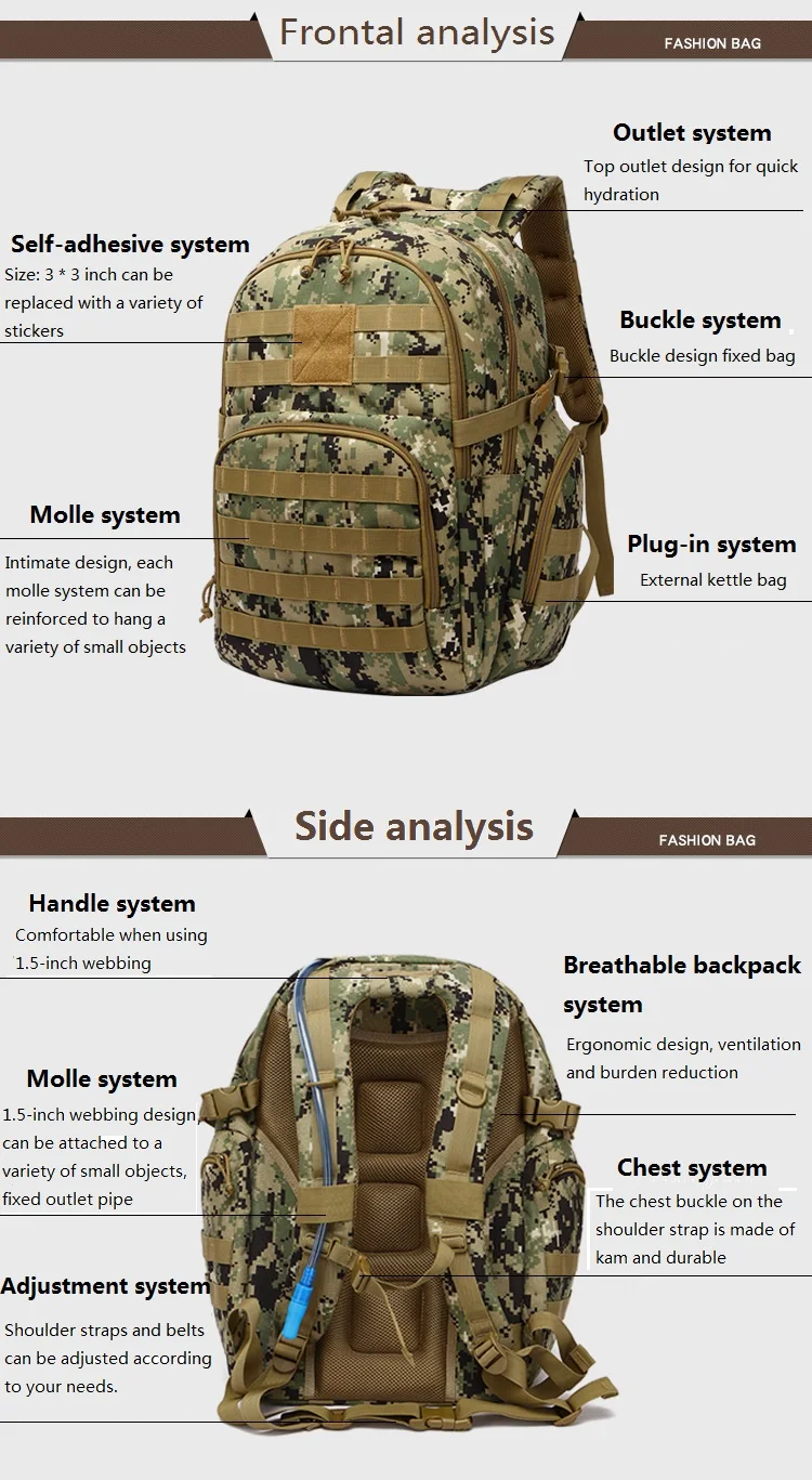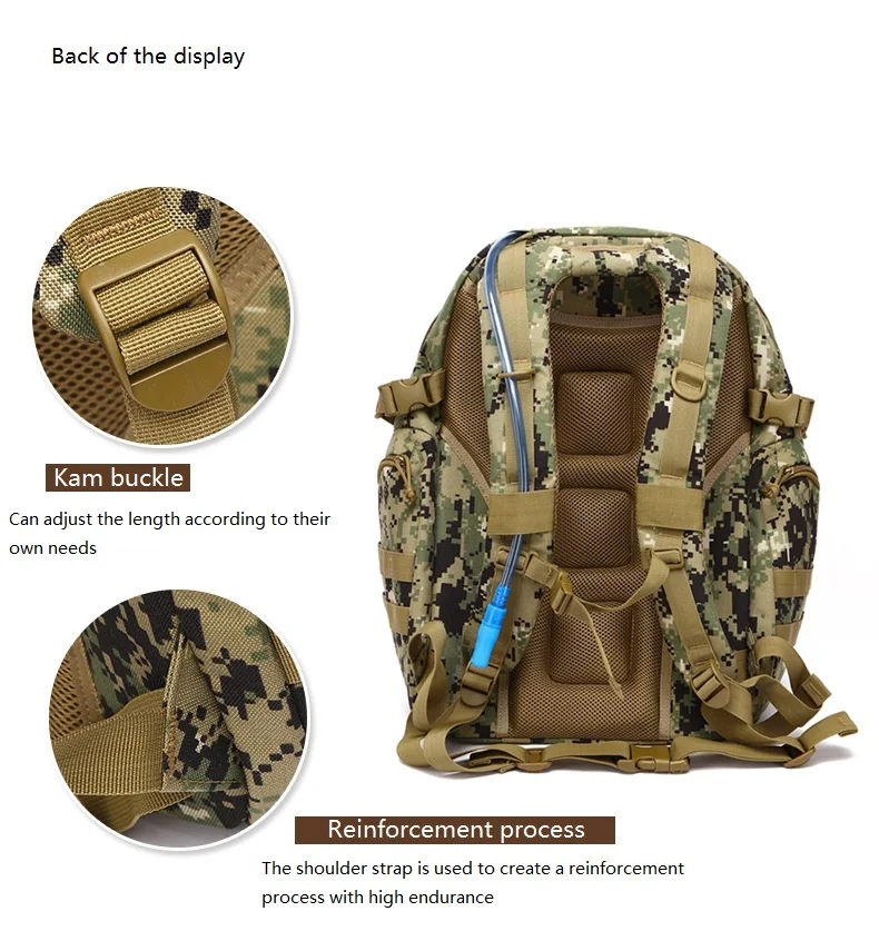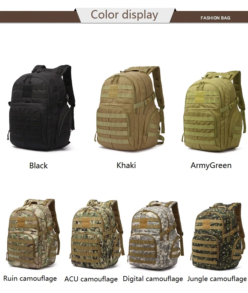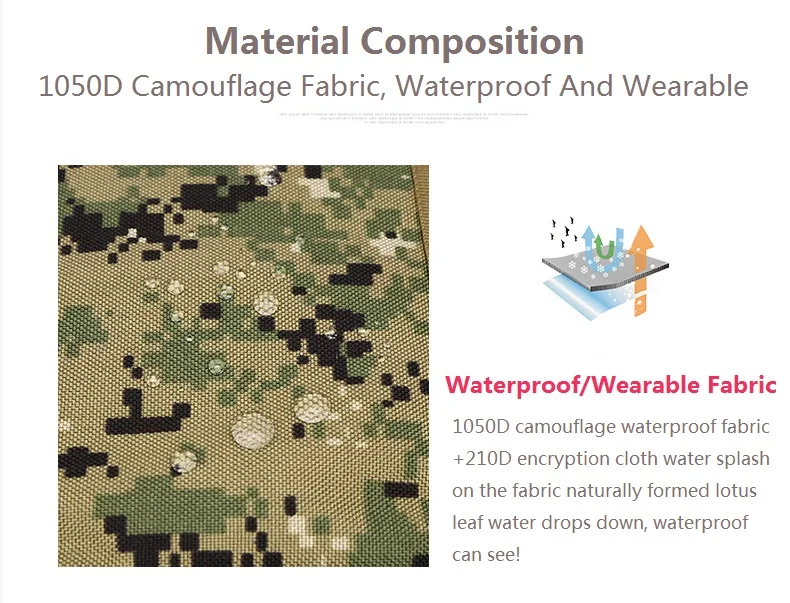 Материал: водонепроницаемый нейлон Цвет: черный, хаки, армейский зеленый, руины Камуфляж, ACU камуфляж, цифровой камуфляж, джунгли камуфляж Размер: 30*19*52 см Подходит: спорт, кемпинг, туризм, альпинизм, унисекс, человек, который преследует моду Все фотографии-это настоящая съемка, но из-за воздействия освещения и разных экранов цвет будет немного отличаться. Все размеры выполнены вручную, поэтому возможны отклонения на 1-2 см. Спасибо.