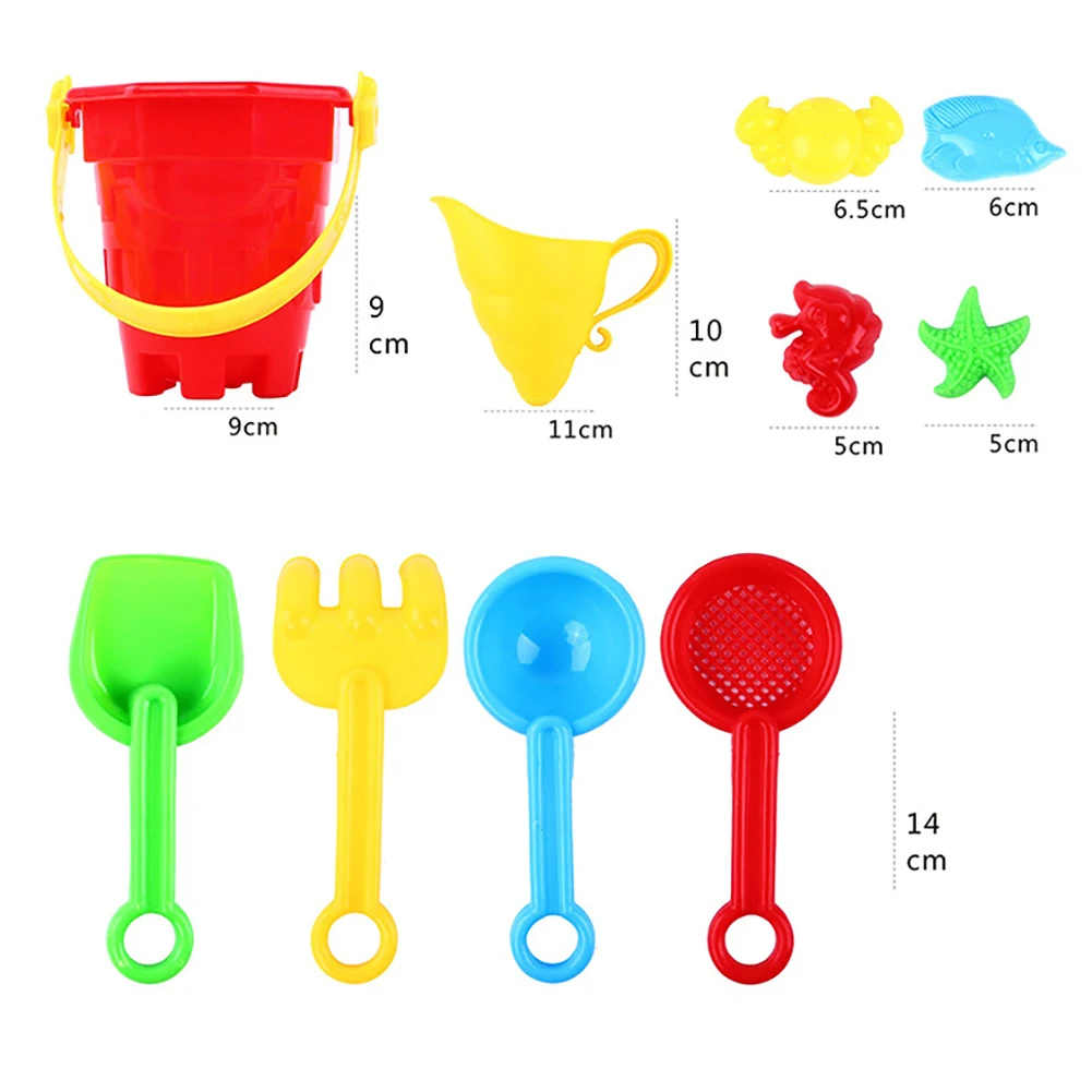 3 ведра: 8 см x 9 см/3,15 дюйма x 3,54 дюйма, рыба: 8 см/3,15 дюйма, краб: 9 см/3,54 дюйма, лейка: 11 см x 8 см/4,33 "x 3,15", ложка: 14 см/5,51 "(прибл.)