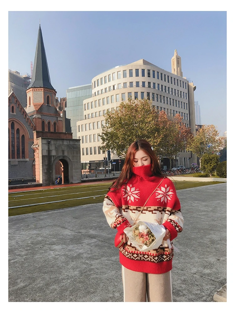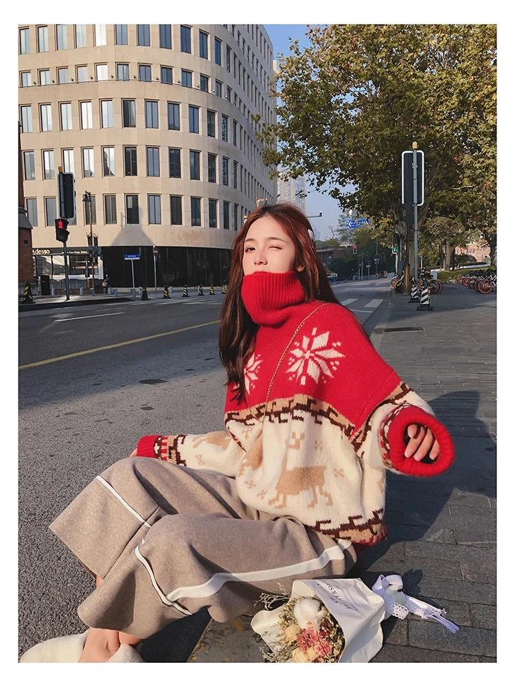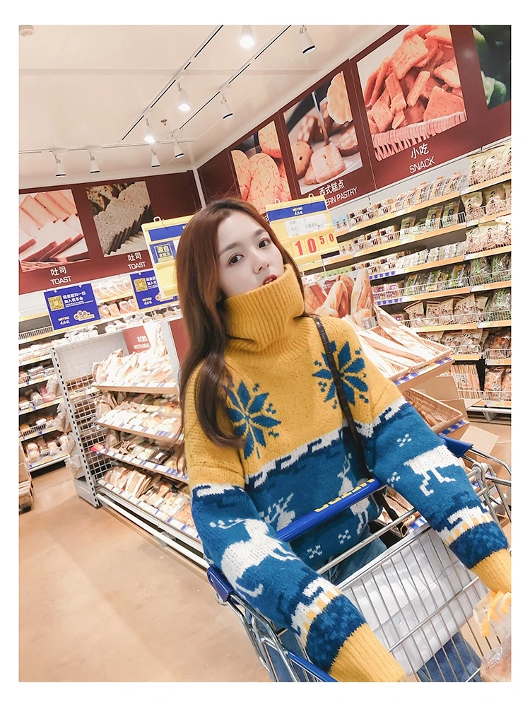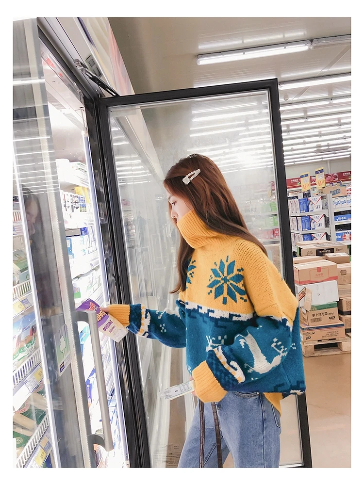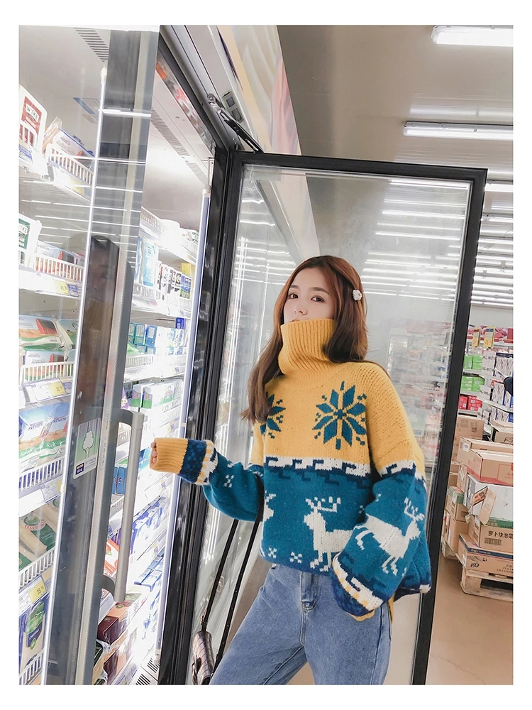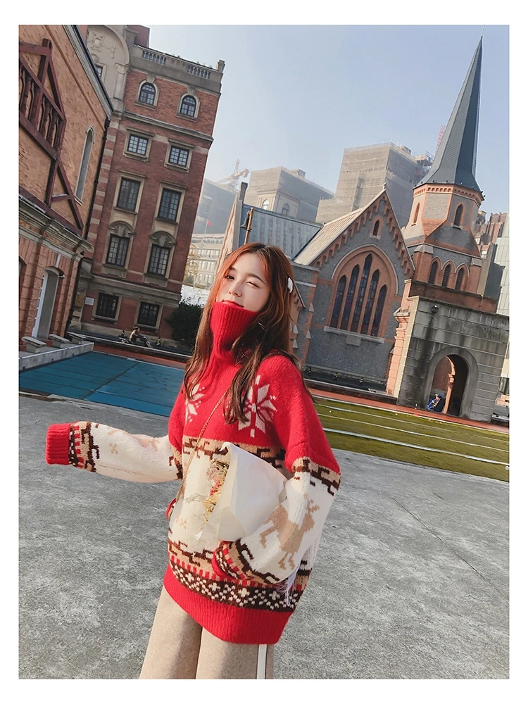 Женский Рождественский свитер со снежинками, оленями, водолазка, свободный утепленный пуловер, винтажное теплое пальто в стиле Харадзюку, Осень-зима V769