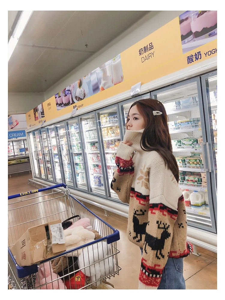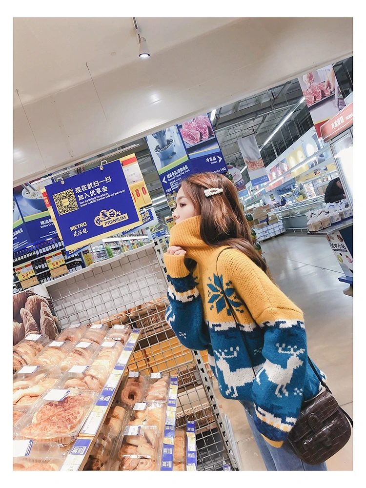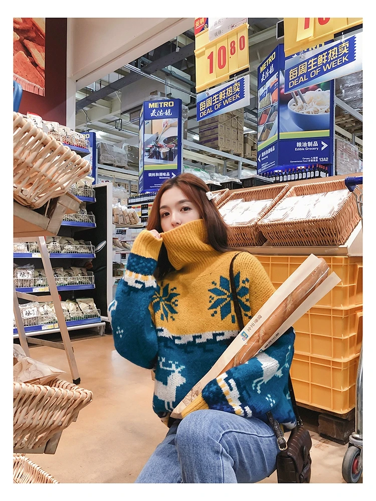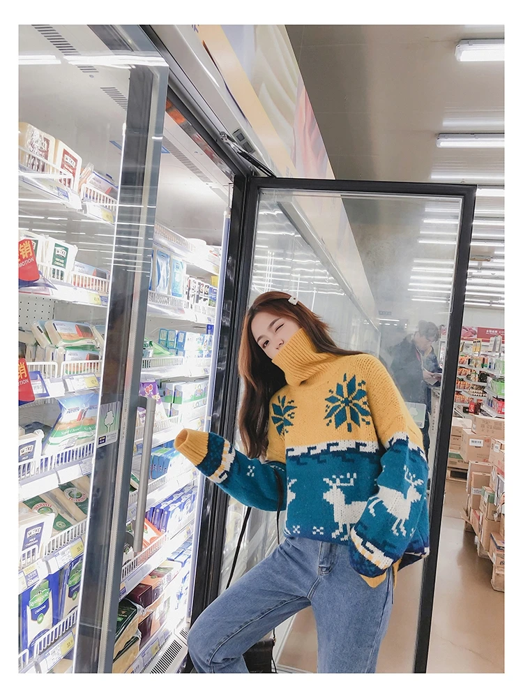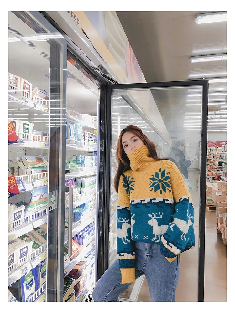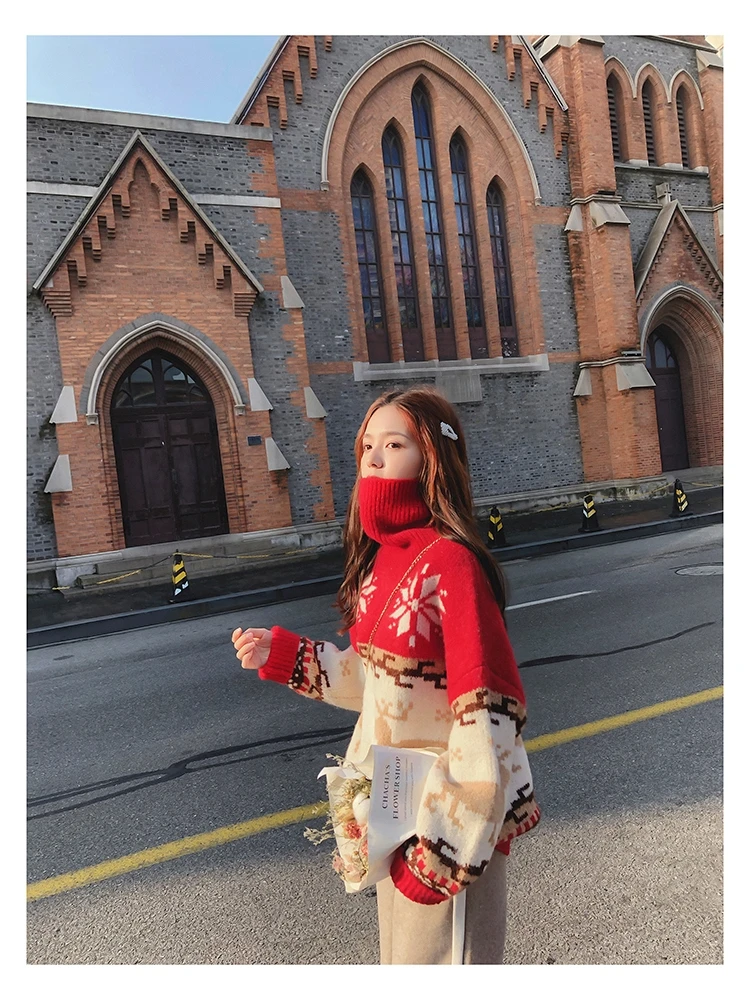 Женский Рождественский свитер со снежинками, оленями, водолазка, свободный утепленный пуловер, винтажное теплое пальто в стиле Харадзюку, Осень-зима V769